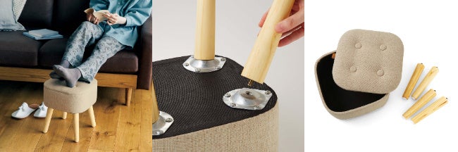 座面はクッション入りでほどよくやわらかな座り心地。オットマンとして使えば、リラックスタイムにもぴったりです。脚付きだから床のお掃除がしやすく、ほこりもたまりづらいのはうれしいポイント。4本の脚を取り付けるだけなので、工具不要で組み立ても簡単です。