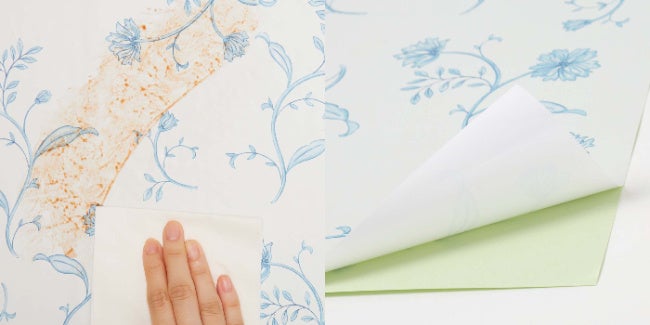 汚れたらさっとふいてお手入れできます。裏面のはく離紙をはがして、貼るだけです。キッチンの扉に貼れば、汚れ防止だけでなく、キッチン全体のイメージチェンジもかないます。