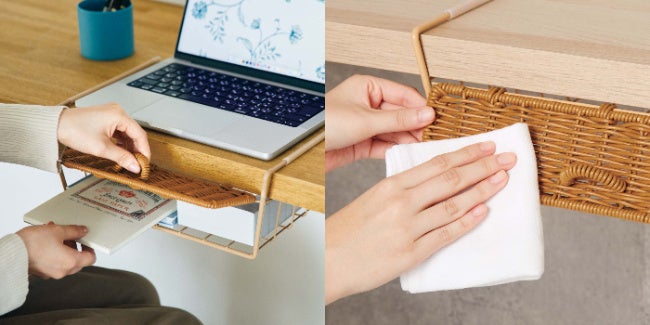 引き出しのないデスクやテーブルにも差し込んで使えます。扉は汚れたら、さっと水拭きで清潔をキープ。