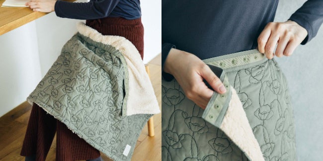 肩に掛けたり、ひざ掛けにしたり通常のブランケットとしてももちろん使えます。腰に巻くときは、お好みの位置でスナップボタンを留めて調節できます。
