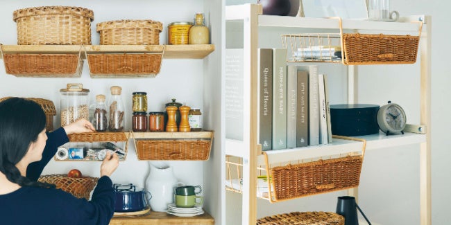 今ある棚に差し込むだけで手軽に収納スペースが作れるスチールラックです。オープンラックや本棚、カラーボックス、テーブルの下などのデッドスペースを有効活用できます。天然素材風の扉が付いているので、表からラックの中身が見えないように隠すことができるのもポイントです。キッチンでは、ラップやふきんなど、生活感が気になる雑貨をおしゃれに目隠ししてくれます。いくつか並べて使うと、インテリアが統一感のあるすっきりとした印象に。