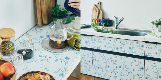 キッチンのワークトップなどに貼るだけでおしゃれに変身させることができるアンティークフラワー柄のシートです。水や汚れがふき取りやすくなって、120℃の耐熱性もあります。古い陶磁器のようなデザインで、手間をかけずにキッチンをあこがれのアンティークな雰囲気に仕上げてくれます。