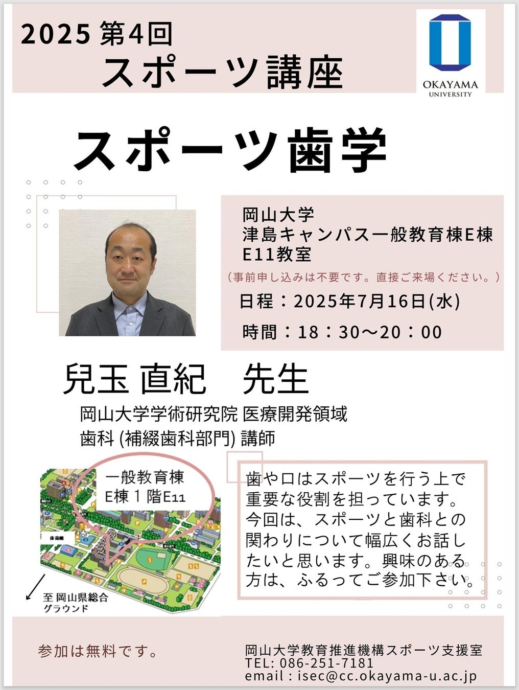 【岡山大学】2025年度第4回スポーツ講座「スポーツ歯学」〔7/16,水 岡山大学津島キャンパス〕