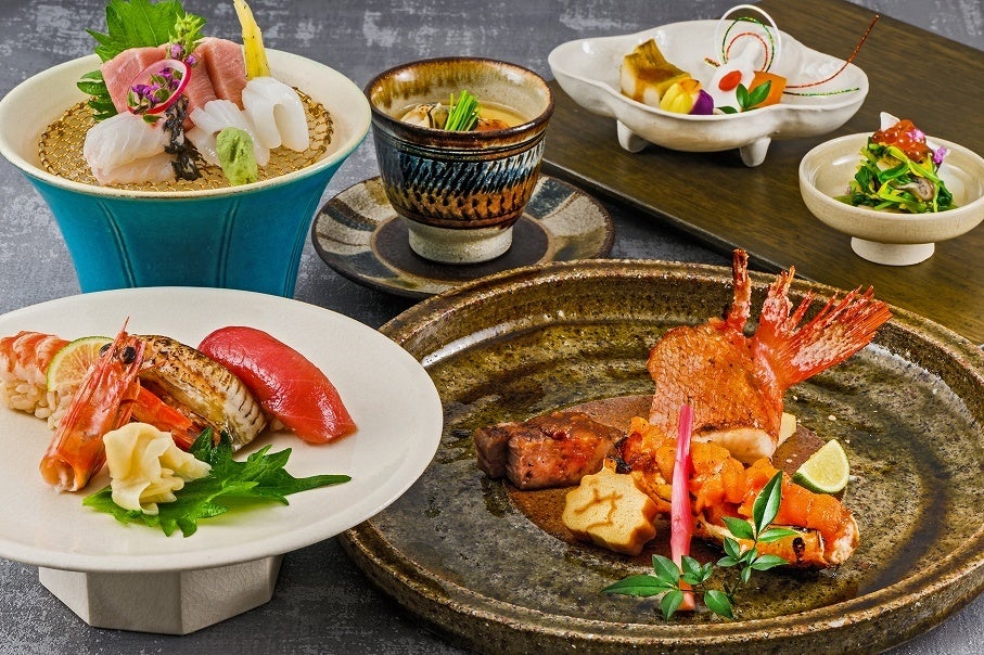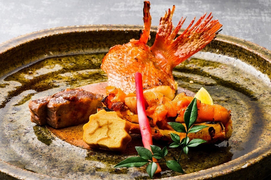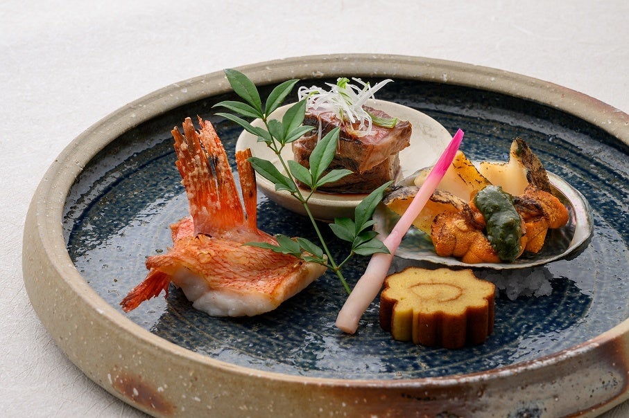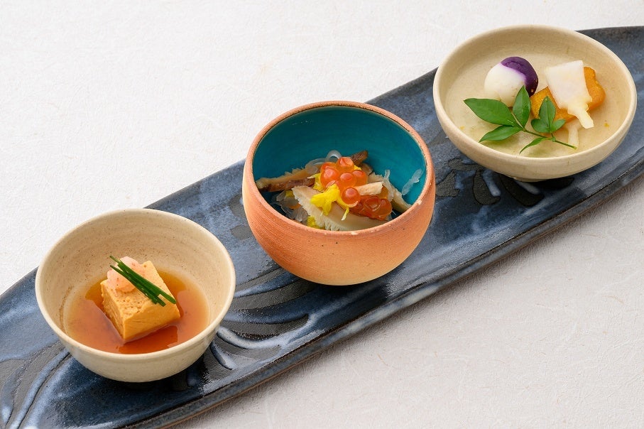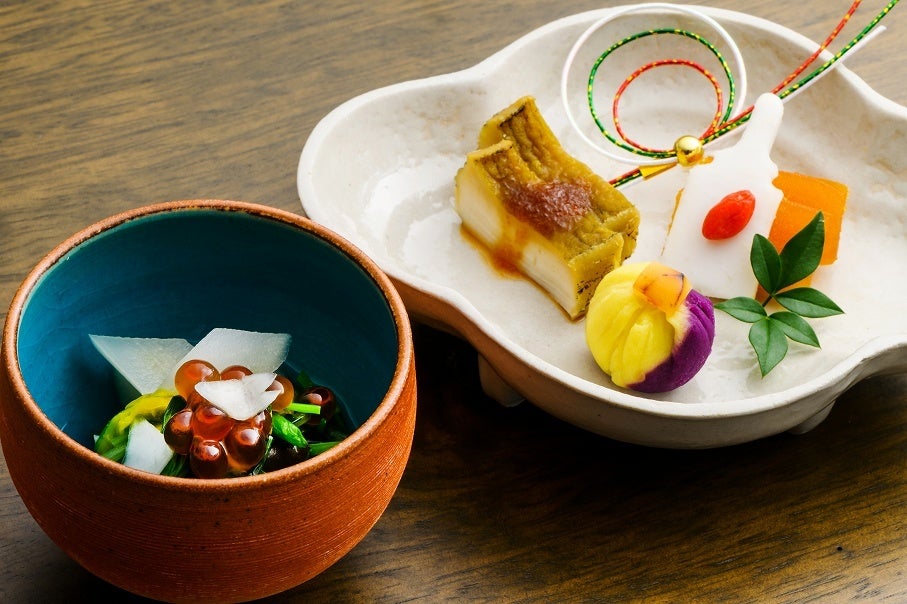 新年を迎える喜びやおめでたい気持ちを佐和の料理人の粋と技で表現した会席をご用意。年末年始の4日間限定で提供します。祝肴には、5色なますや筋子醬油漬けのほか、読谷村産泡盛「残波プレミアム」に漬けた県内でも珍しい自家製唐墨もご用意。土瓶蒸しには高級魚ののどぐろを使用し、出汁に焼いたのどぐろの骨を入れて煮込むことで、香ばしさと旨味を濃縮させました。炊き合わせは棒鱈や海老芋、堀川牛蒡などの京都料理だけではなく筍や菜の花を入れることで季節を感じる一品に仕上げています。御食事には鮪赤身漬けなどの握り寿司を、そして甘味には、栄養価が高いと言われる泡盛酒粕を生地に練り込んだ饅頭を召し上がっていただきます。
