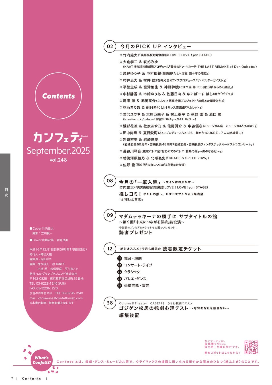 「エンタテインメントを、もっと身近なものに。」を理念とするロングランプランニング株式会社(東京都新宿区、代表:榑松大剛)は、シアター情報誌「カンフェティ」9月号 vol.248 を2025年8月4日(月)に発行いたします。配布場所は、首都圏を中心とした劇場・ショップ・駅など合計1,500箇所以上に設置されます。