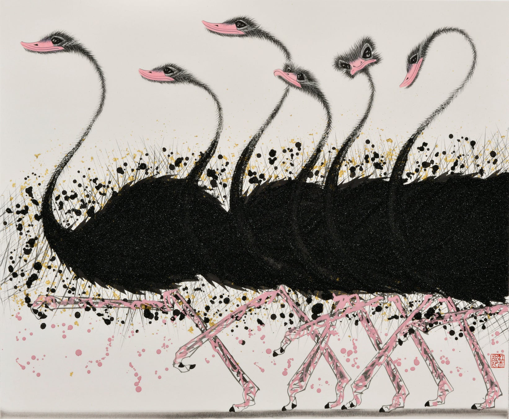 日本画という歴史と伝統のある表現の世界において、黒を基調としたモノトーンの「駝鳥」を発表し、鮮烈にデビューをされた福井江太郎氏。その後も菖蒲や薔薇など花の美しさや色彩を独自の解釈や表現方法、伝統的な日本画の技法を用いつつ斬新な作品を制作し、常に新たな挑戦を続けています。今回の個展では代表作とも言える「駝鳥」や「薔薇」の作品をはじめ、新作約30点を一堂に展覧いたします。