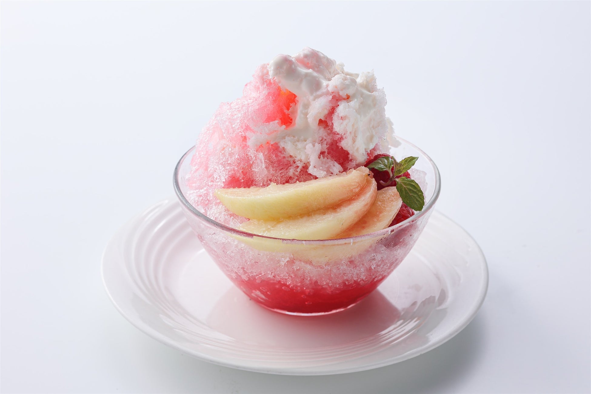 見た目も涼やかな至極のスイーツもラインアップ!サクサクの生地にメロンジュレや白あんなど加え、和テイストの「メロンタルト」や、しっとりふんわり食感の生地のスポンジにピーチ寒天が包まれた「ピーチロール」などのほか、爽やかなグラススイーツ「ピュアメロンゼリー」、「ピーチシャーベット」などがビュッフェ台を彩ります。さらに、ディナー限定でお口直しにもおすすめな「ピーチシェーブアイス」が新登場!シェフが目の前で削るクッキングサービスでご提供します。