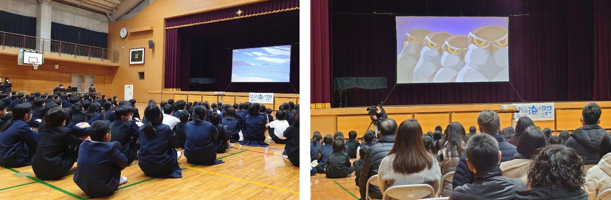 上映会にはさぬき市立津田小学校の全児童と保護者、あわせて約200名が参加しました。津田町の北山地区に伝わる民話で、参加者の認知度は低く、初めて民話の内容を知る子どもたちも多かったです。上映が始まると前方スクリーンで放映されるアニメーションを熱心に視聴、愛着のある津田の松原海岸の美しい風景や島々の画に釘付けになる子どもや保護者の皆さん。最後までしっかりと見入っていました。