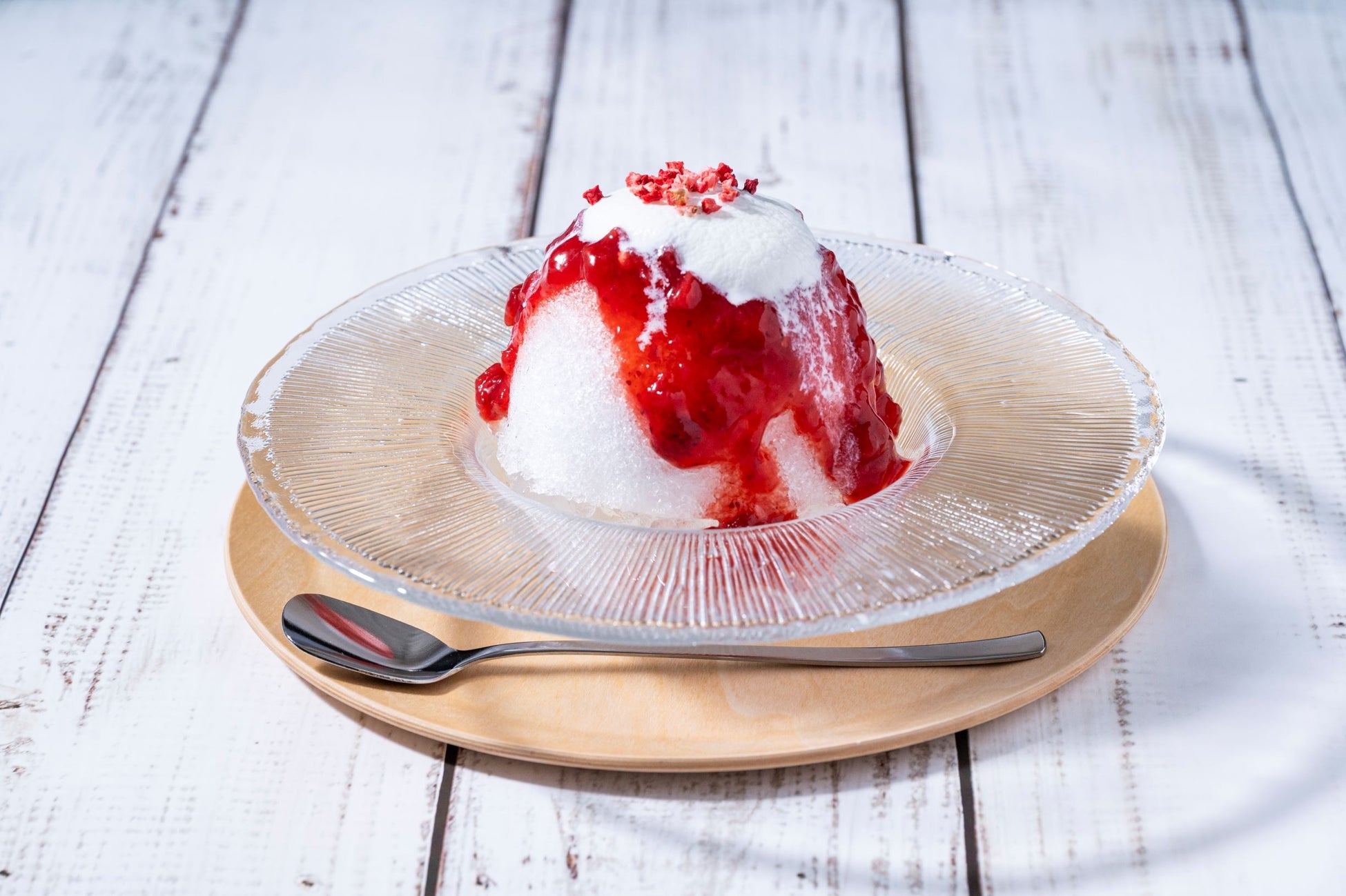 中にバニラアイスを隠した純氷の上に、苺のコンフィチュールと練乳のエスプーマをトロリとかけました。