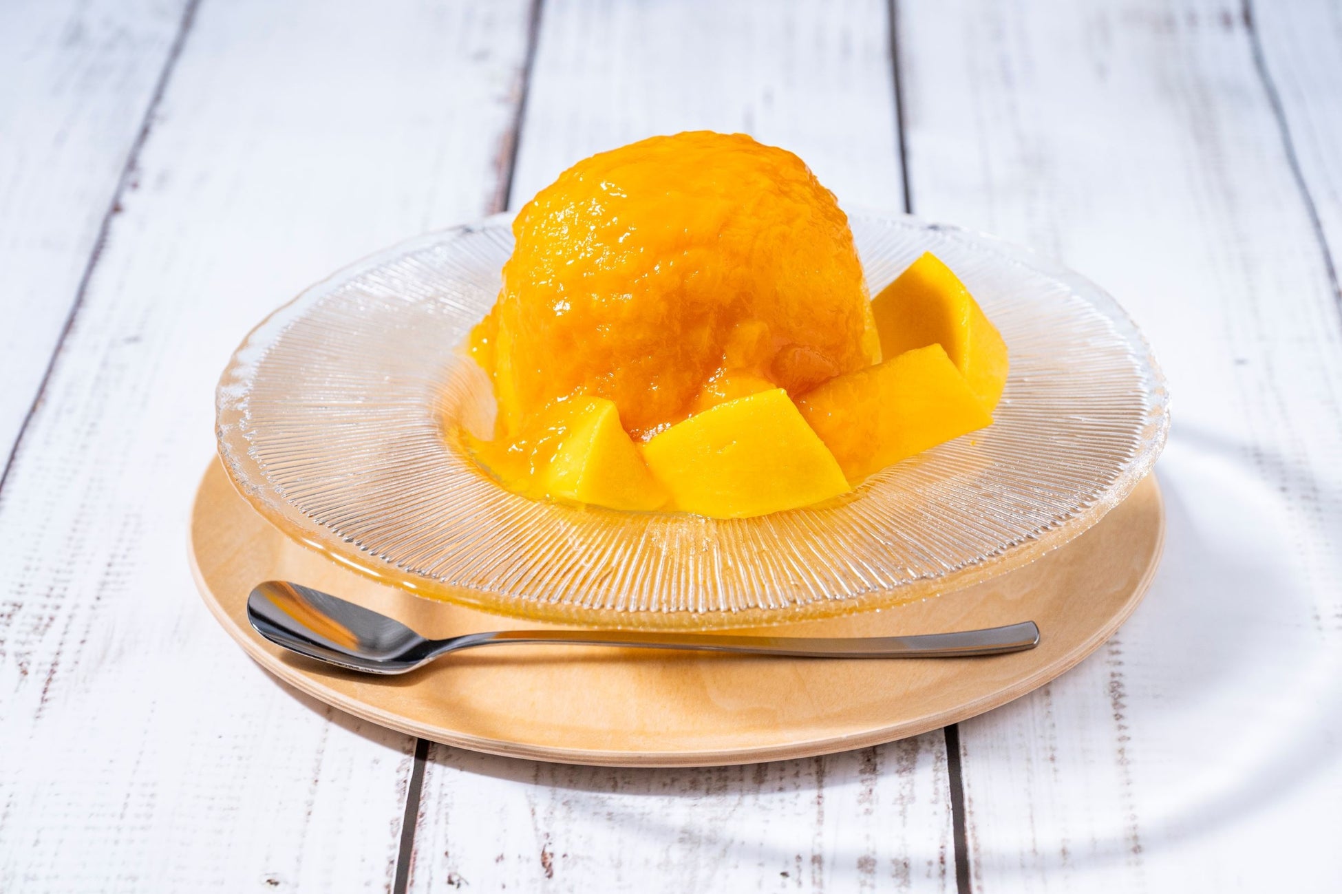 甘みと酸味のバランスがちょうど良いタイ産のマンゴーを使用。そのマンゴーソースにはパッションフルーツをブレンドし、爽快感のある酸味をプラスしました。純氷の中には杏仁プリンとヨーグルトアイスが入っています。