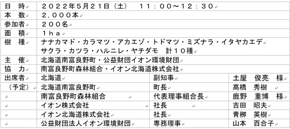 北海道南富良野町(町長 髙橋秀樹)と公益財団法人イオン環境財団(理事長 岡田卓也 イオン株式会社 名誉会長相談役)は、5月21日(土)、第3回「北海道 南富良野町植樹」を実施します。