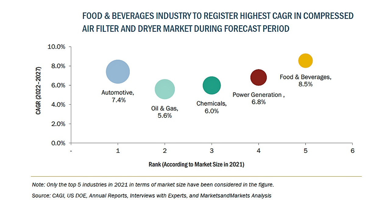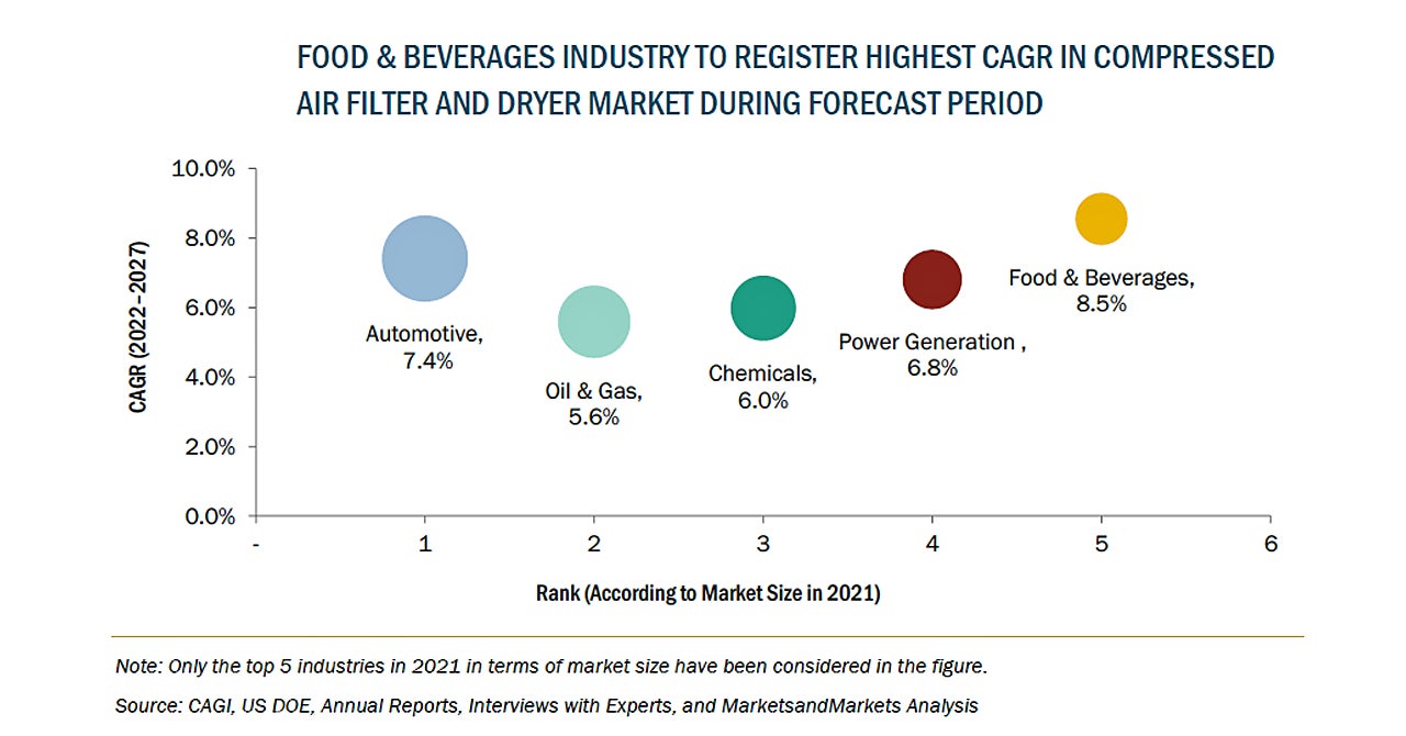 圧縮空気フィルターと乾燥機の市場規模は、2022年の54億米ドルからCAGR6.2%で成長し、2027年には73億米ドルに達すると予測されています。同市場成長の背景には、生産性向上のための圧縮空気システムの採用拡大、食品・飲料業界からの圧縮空気ソリューションに対する需要の急増、危険な腐食環境から機器を保護するための圧縮空気乾燥機の使用拡大などがあります。