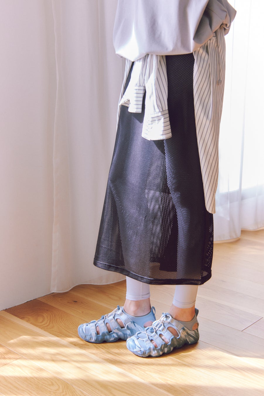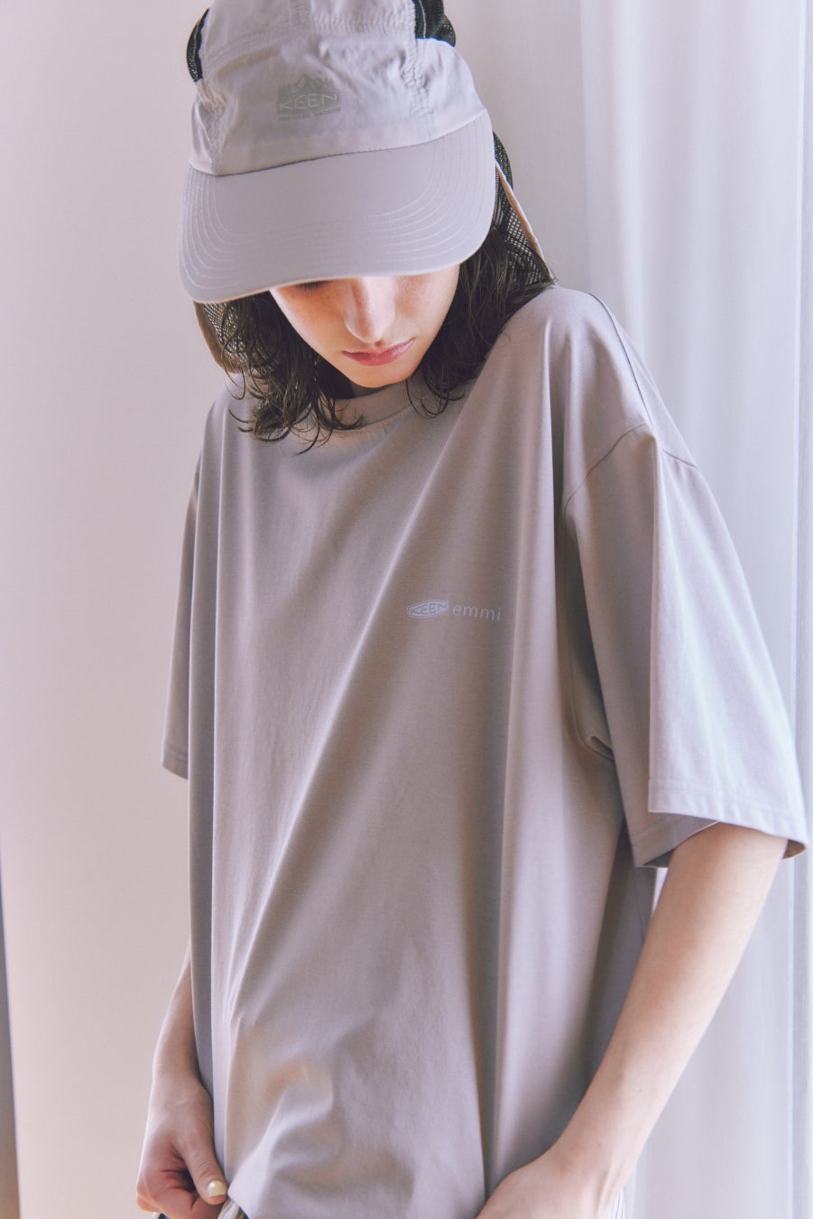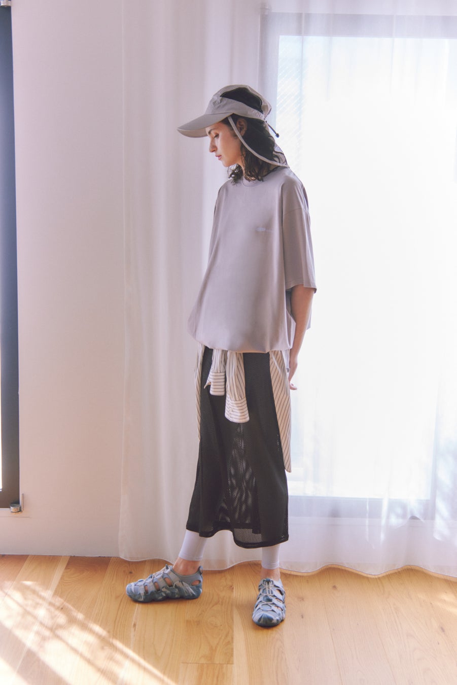 Tシャツに、メッシュワンピースのセットアイテム。Tシャツには、ハーブミント由来の接触冷感素材「NICE MINT」を使用。植物性抗菌、消臭機能も嬉しいポイントです。KEEN HYPERPORT H2の今シーズン新色とカラーを合わせ、爽やかなブルーのグラフィックを乗せたTシャツは、ビッグシルエットかつドロスト仕様なので、丈感の調整によって印象を変えられます。KEENのシューズにも使用される バンジーコードとストッパーつきで、胸にはemmiとKEENのダブルネーム入り。