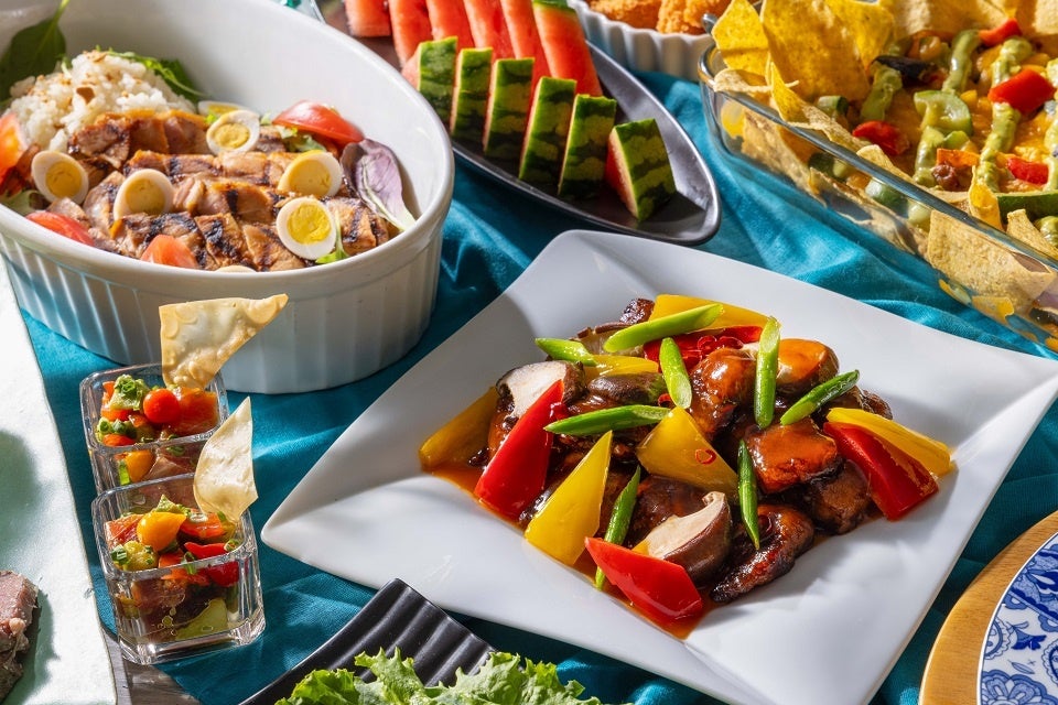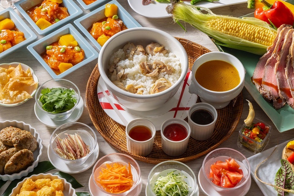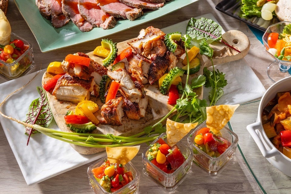 メニューには、マグロと香味野菜を醤油ベースのタレに絡めた伝統的なハワイ料理「アヒポケ マウナラニ スタイル」をはじめ、トルティーヤに味付けされた豚肉と濃厚チーズを挟んだメキシコのファストフード「ケサディーヤ」、しっとりとジューシーに炊き上げた鶏肉とご飯を、お好みの薬味とソースでお召し上がりいただく東南アジアの人気料理「シンガポール風チキンライス、各種ソースと薬味添え」など、グルメ旅行を彷彿とさせる異国情緒溢れるメニューが勢揃い。その他にも、スパイスの効いたジャマイカ料理「ジャークチキンと夏野菜のソテー」や、甘辛く味付けされたフィリピンの豚肉料理「トシーノ」を盛り込んだ「フィリピン風ポークグリル“トシーノ”ガーリックライス添え」など、ちょっと珍しいメニューも並びます。さらに、メインディッシュとなる丁寧にじっくりと焼き上げたローストビーフは、ご注文ごとに切り出し、お席までお持ちします(おかわり可能)。贅沢な肉の旨味が口いっぱいに広がるローストビーフを心ゆくまでお楽しみください。