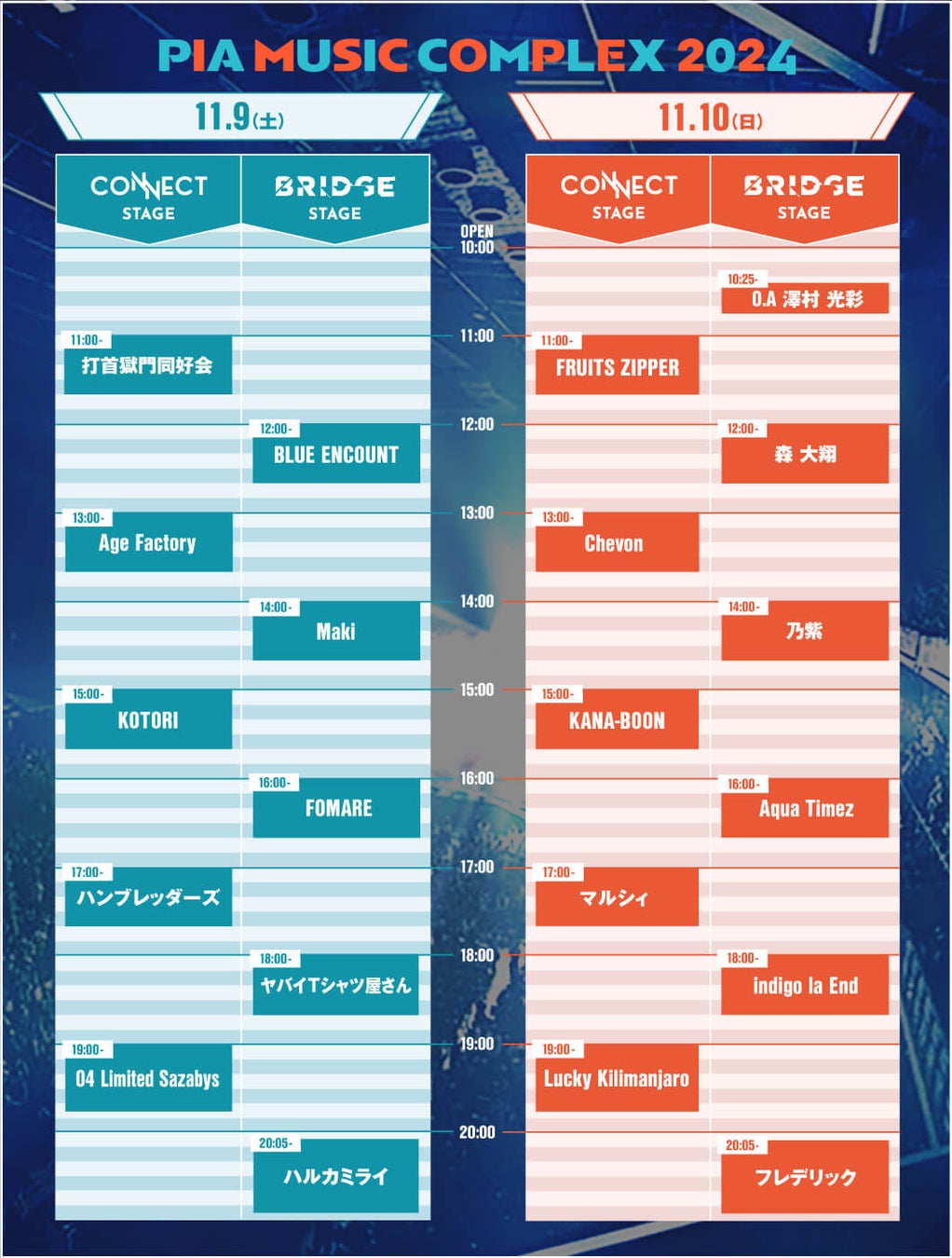 2024年11月9日(土)・10日(日)、横浜・ぴあアリーナMMにて「PIA MUSIC COMPLEX 2024」を開催。本日、タイムテーブルを発表いたします。