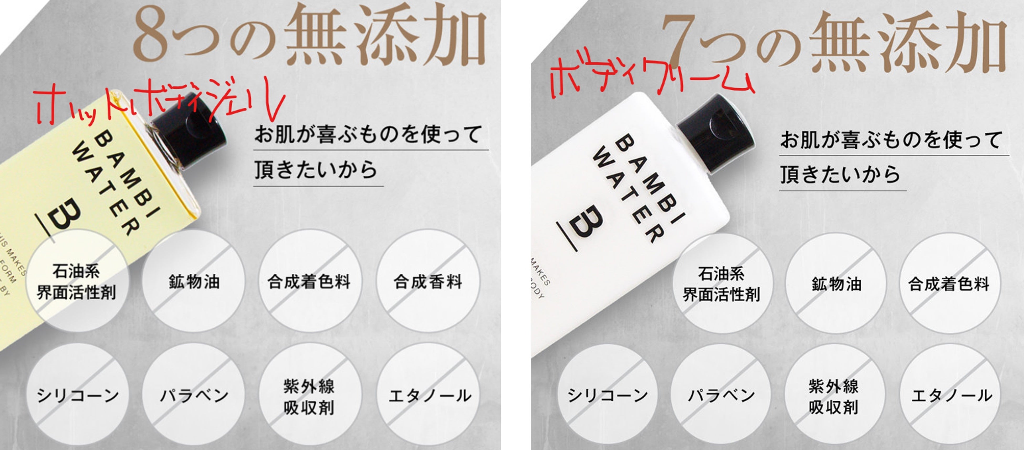 ※ボディクリームは7つの無添加(石油系界面活性剤、鉱物油、合成着色料、シリコーン、パラベン、紫外線吸収剤、エタノール無添加)