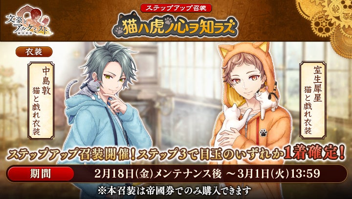 文豪の「衣装」や、会派に装備する事で能力を強化できる「装像」などが入手できるコンテンツ「召装」に、限定召装「猫ハ虎ノ心ヲ知ラズ」が期間限定で登場します。この召装では新しく追加された中島敦と室生犀星の〈猫と戯れ衣装〉を獲得できます。