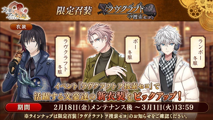 合同会社EXNOA(本社:東京都港区、CEO:村中 悠介、URL:https://games.dmm.com/)が運営するDMM GAMESは、2月18日(金)より、女性向け文豪転生シミュレーションゲーム「文豪とアルケミスト」において、イベント『調査任務「ラヴクラフト ヲ捜索セヨ」』と限定召装「ラヴクラフト ヲ捜索セヨ」を開催いたしました。