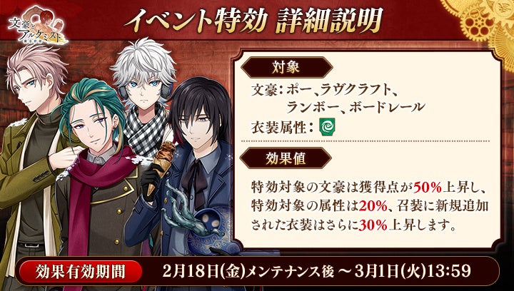 期間中「ポー」「ラヴクラフト」「ランボー」「ボードレール」の衣装を編成して潜書すると、得点の獲得数がそれぞれ50%上昇します。また、「風」属性の衣装を編成して潜書すると、得点の獲得数がそれぞれ20%上昇します。
