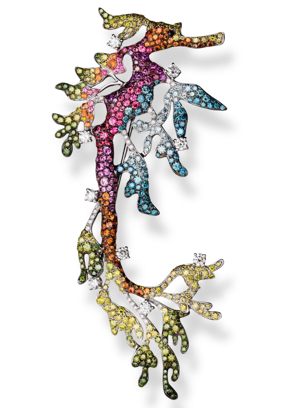 イタリアの彫金界重鎮であるデザイナーにより、高度な石留め技術を用いて、一石ずつ違う色の宝石にてこの色彩に富んだ生物が表現されました。