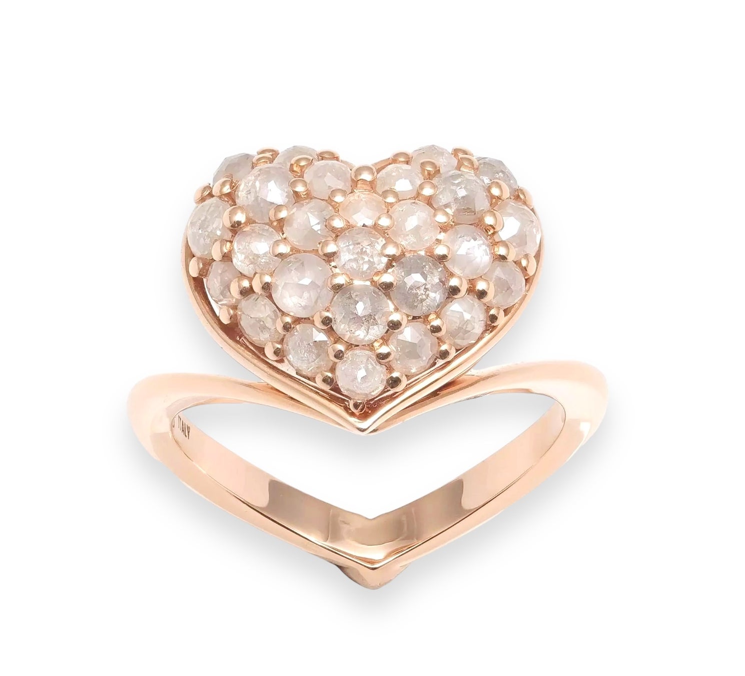 丸みを帯びたハートの造形に宝石を寸分違わず留めて行く事で、ピンクゴールドの輝きと相まって優しく可愛らしい遊び心のある作品となっています。