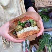 天然酵母のパンに、山形県浦田農園さんの香り高い秘伝豆を使ったファラフェルとオーガニックの野菜が入った贅沢なサンド。輸入食品でなく地域の食材を選び、ひよこ豆の代わりに無農薬大豆を使っています。