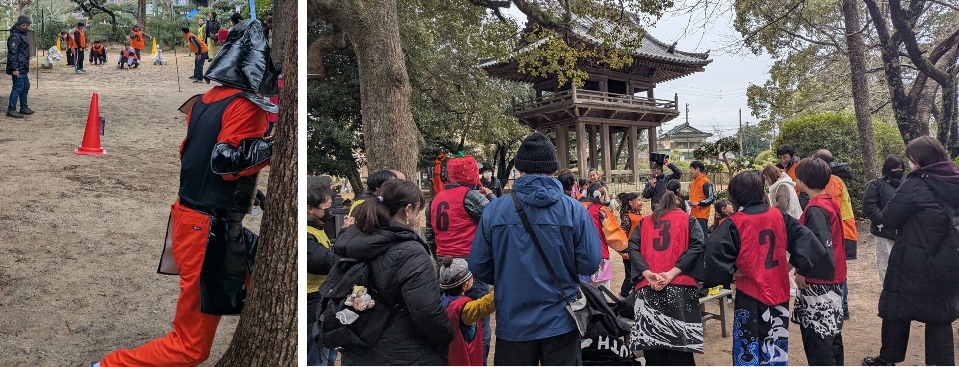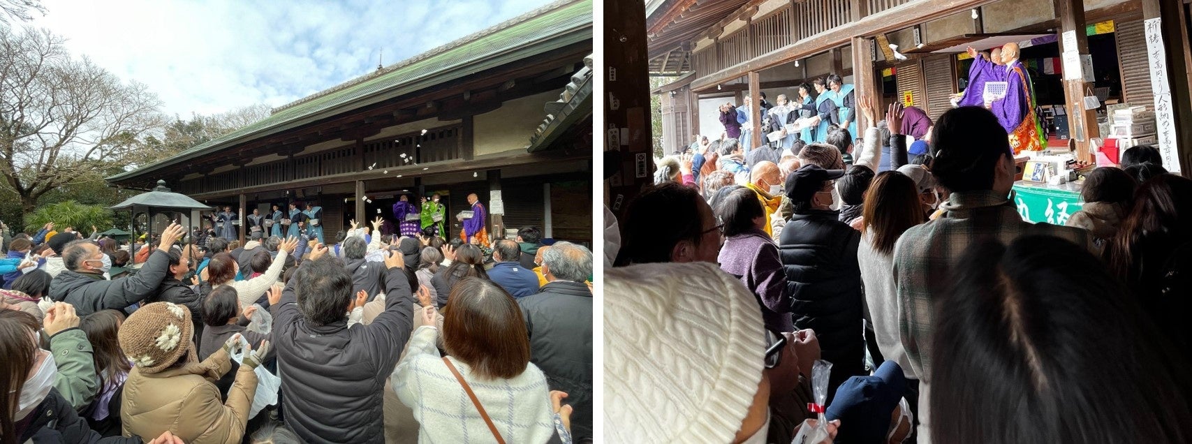 本イベントと同時開催で野間大坊で毎年行われている節分祭もありました。野間大坊の節分祭は有名で毎年多くの方が訪れています。この日は節分祭参加の方だけでも約200人、入り口は人が入る隙間がないほどでした。豆やお餅がたくさんまかれ、子どもから大人まで真剣に拾っている様子が見られました。