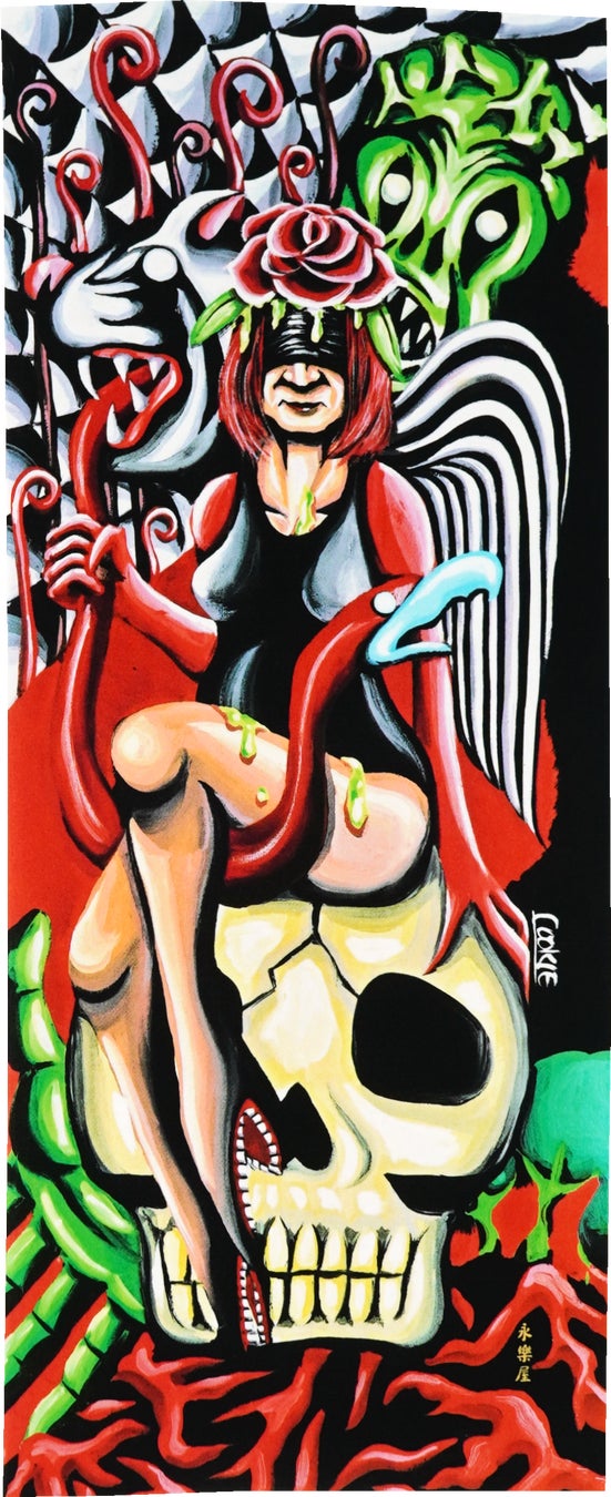 アーティスト“COOKIE”が手掛けた作品『地球社長海外し』は、その意図として「陸、空、森、地底を支配する者。陸がヒョウ、空が鷲、森がゴリラ、地底が髑髏、ソレらを飼い慣らしている感じ。海がないのはなんとなく細辻伊兵衛氏が、苦手そうだなと思ったから。」と、本人から解説がありました。