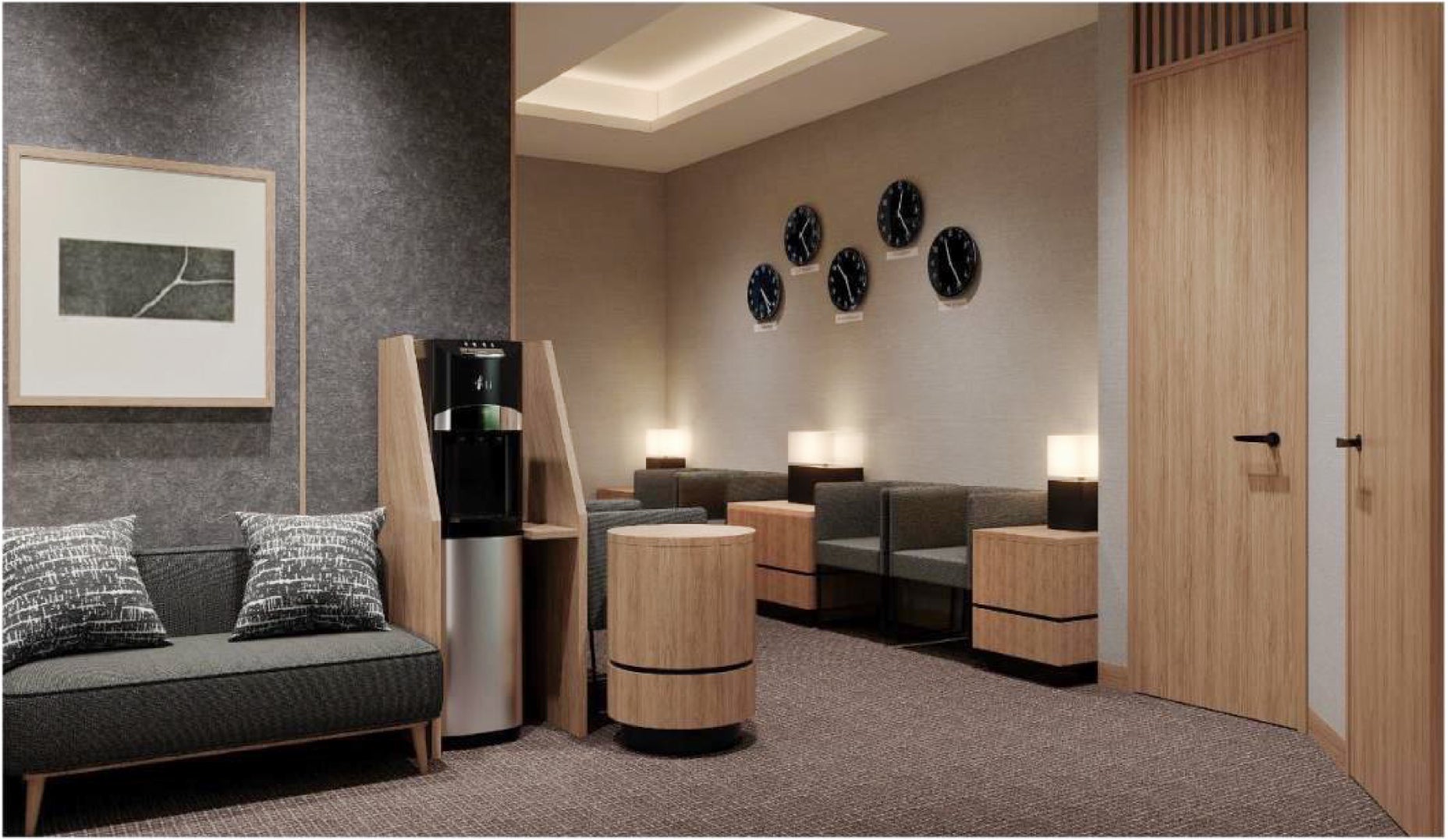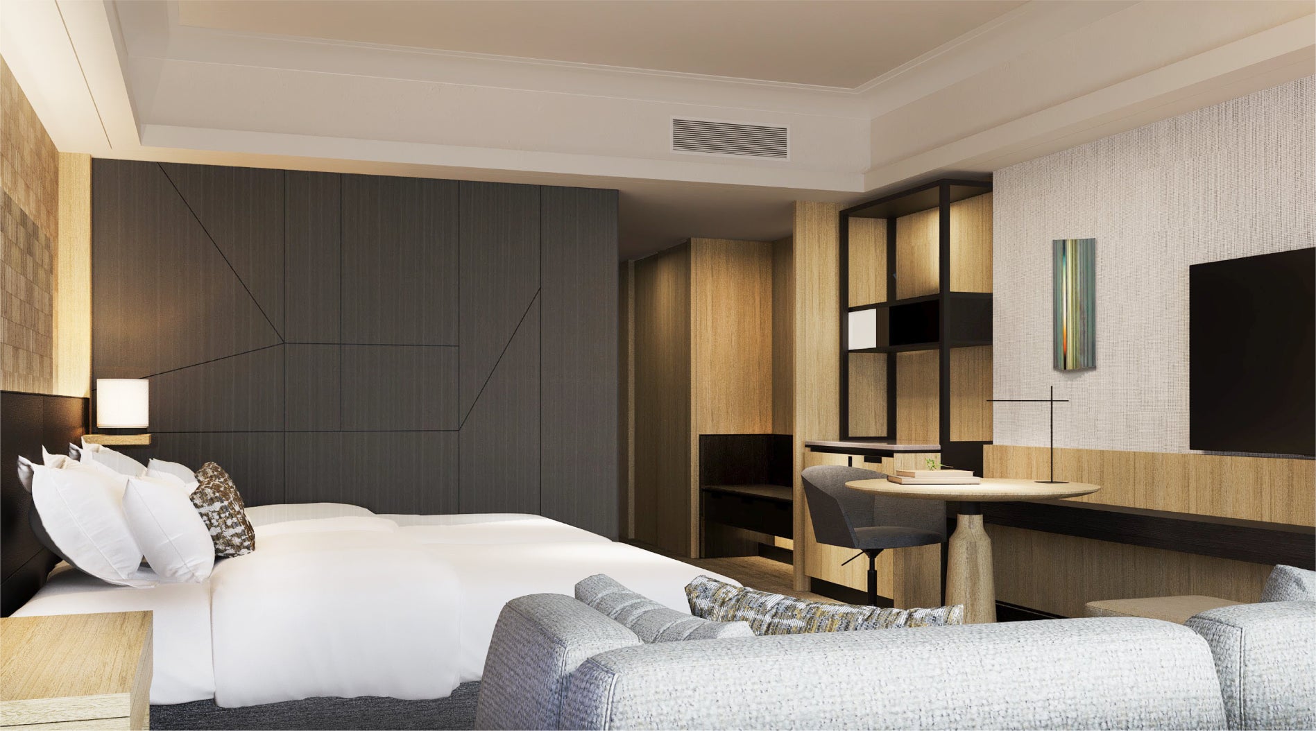 さらに、ロビーフロアに新規オープンする「ホスピタリティルーム」は、チェックイン前やチェックアウト後の休息の場としてご利用いただけるレスティングルームです。ゆったりとしたソファと、パウダールームを兼ねた更衣室、荷物整理台などを備えた機能的で落ち着きのある空間をご提供いたします。