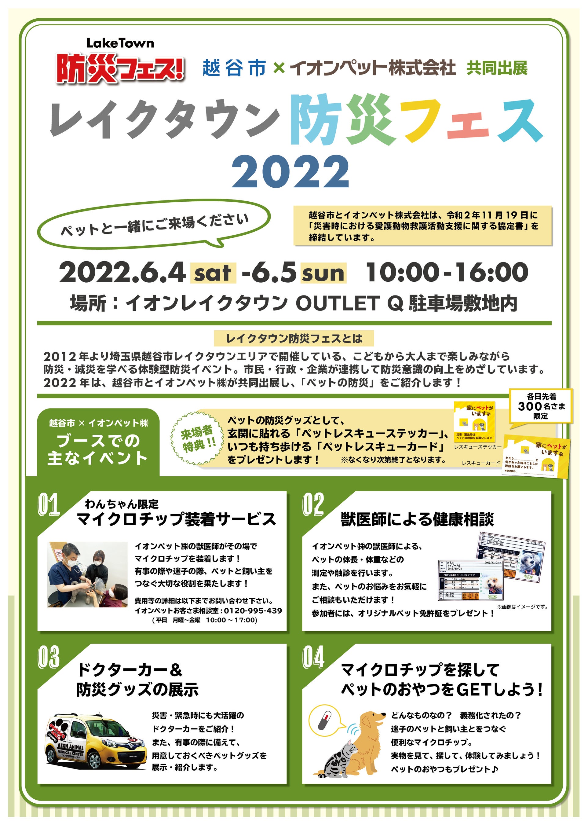 イオンペット株式会社(代表取締役社長:米津一郎、以下イオンペット)は、「ペットの防災への備え」の重要性を地域のペットオーナーに知っていただくことを目的に、6月4日(土)~5日(日)に、レイクタウンOUTLET Q駐車場で開催される「レイクタウン防災フェス2022」に、越谷市と共同出展します。
