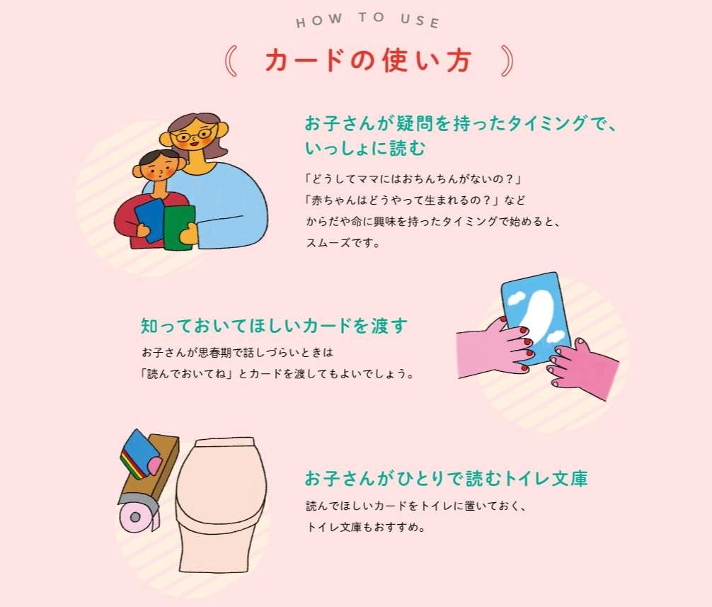 カードは、親子で一緒に読んでお話することもあれば、子どもがひとりでも読めるように推奨年齢に合わせて、ふりがなが振ってあります。必要なカードだけを直接渡して読んでもらうことや、間接的にトイレなどひとりの空間に置いて読んでもらう使い方もできます。