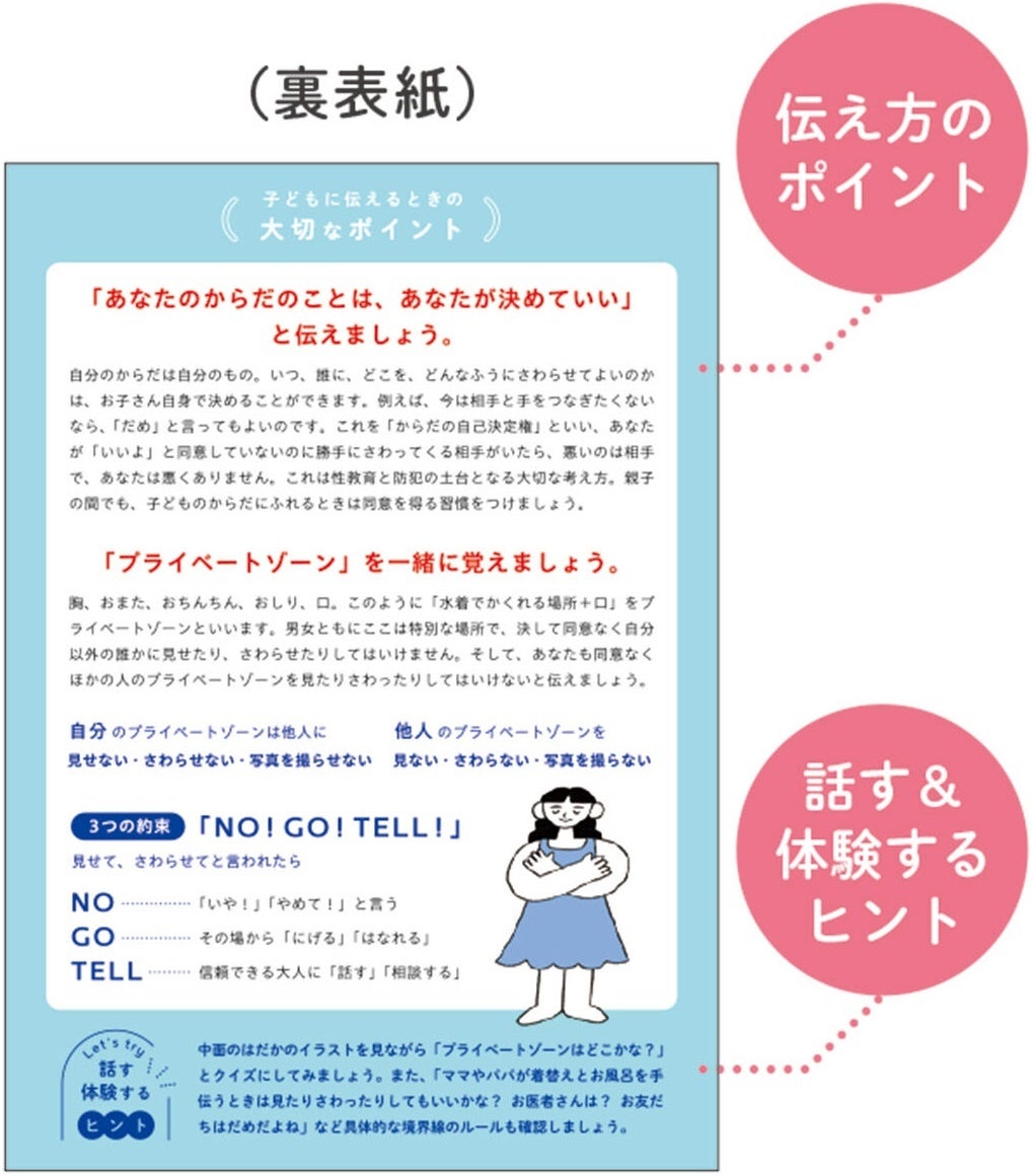 裏面では大人から子どもに伝えるときの大切なポイントと、親子で話し、体験するヒントを記載。会話しながらより理解を深めることができる仕様です。
