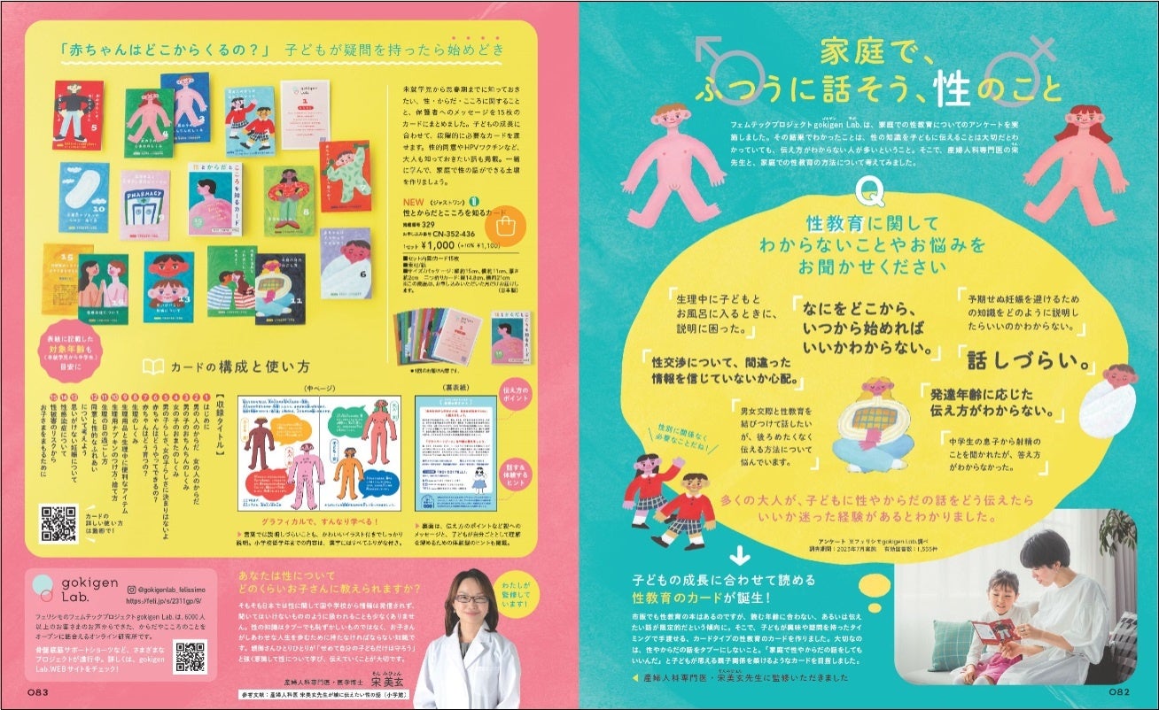 gokigen Lab.が家庭内での性教育についてアンケートを実施したところ、「性の知識を子どもに伝えることは大切だとわかっていても伝え方がわからない」という人が多いということがわかりました。そこで、産婦人科医の宋美玄さんと家庭での性教育の方法について考え、性教育ツールを企画することになりました。性教育の書籍は手に入りますが、子どもが読む年齢に合わない、あるいは伝えたい話が限定的だという傾向もわかりました。そこで、子どもが興味や疑問を持ったタイミングで手渡せる、カードタイプの性教育ツールを制作しています。大切なのは、性の話をタブーにしないこと。「家庭で性の話をしてもいいんだ」と子どもが思える親子関係が築けるようなガイドを目指して開発しています。