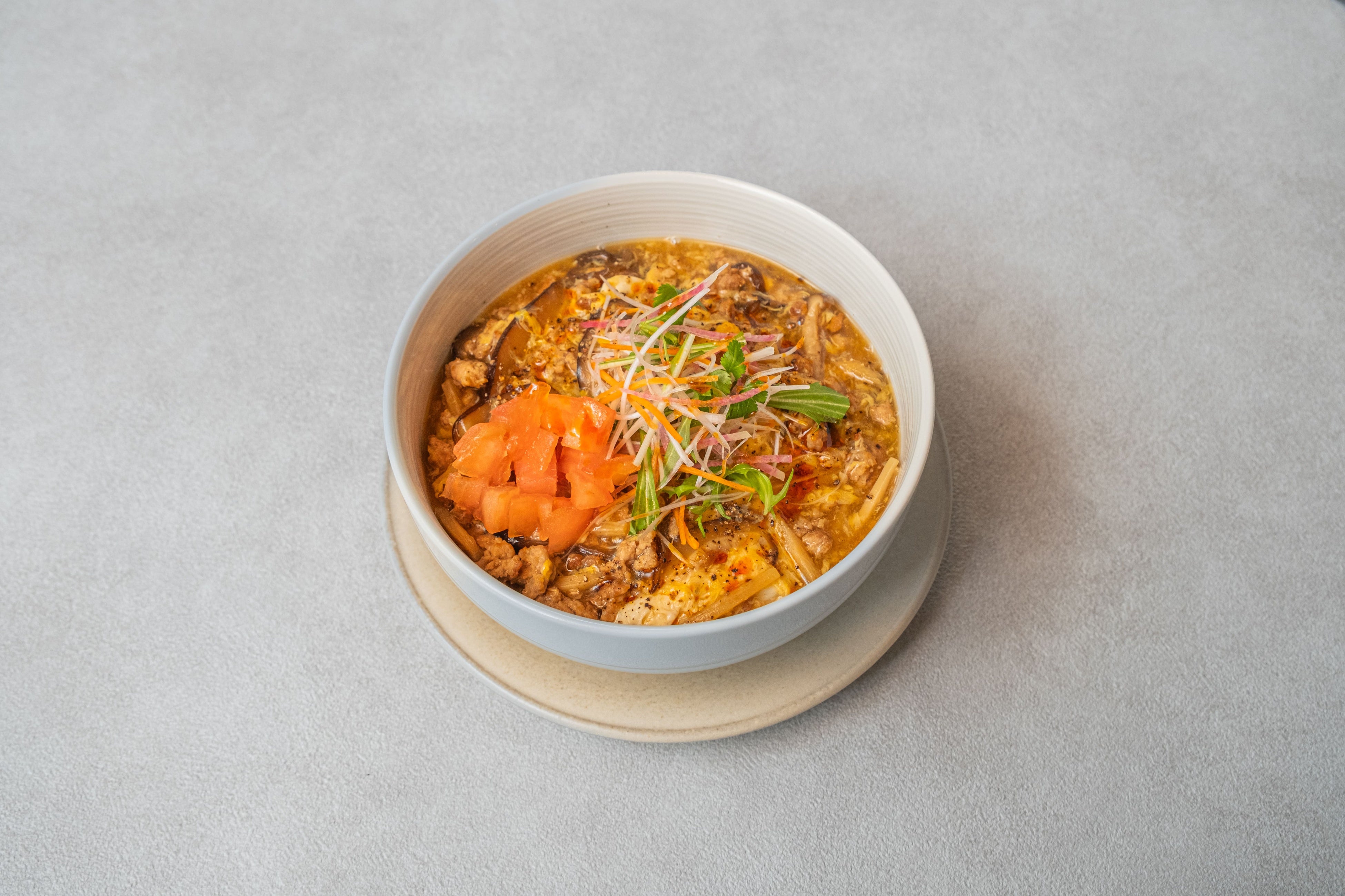 野菜をたっぷり入れたとろみスープ、心地よい酸味と辛味で人気の麺料理に、黄えんどう豆100%でできているゼンブヌードル(丸麺)を使用した、Adaptation流・酸辣湯麺です。