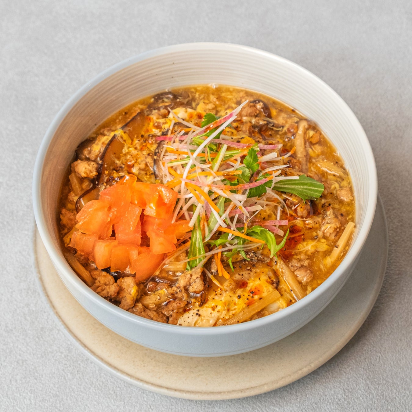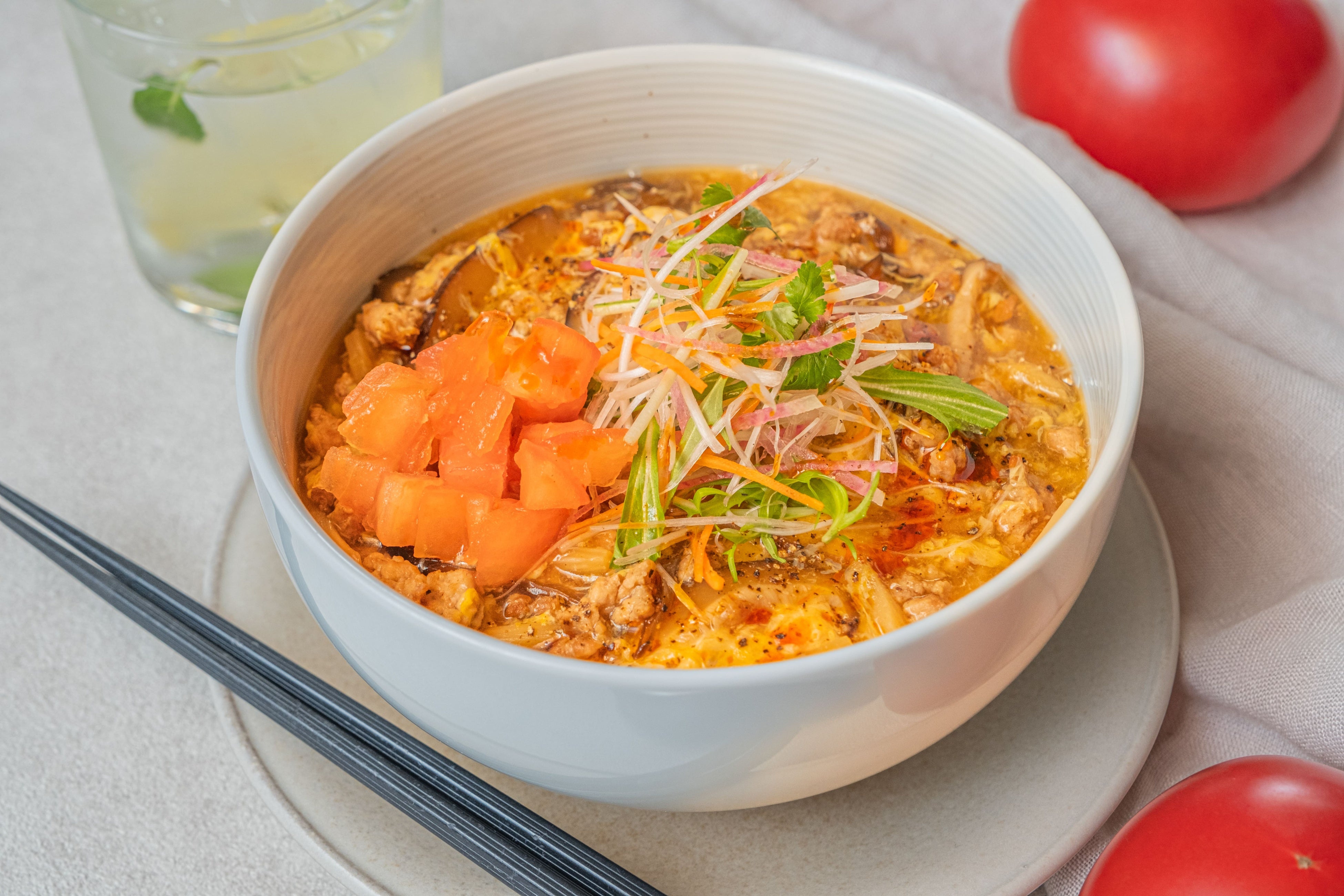 トマト、しいたけ、国産豚ひき肉、ふわふわの溶き玉子の入った具沢山のスープに、黒酢でまろやかな酸味を与え、辣油とコショウでピリ辛に引き締めました。