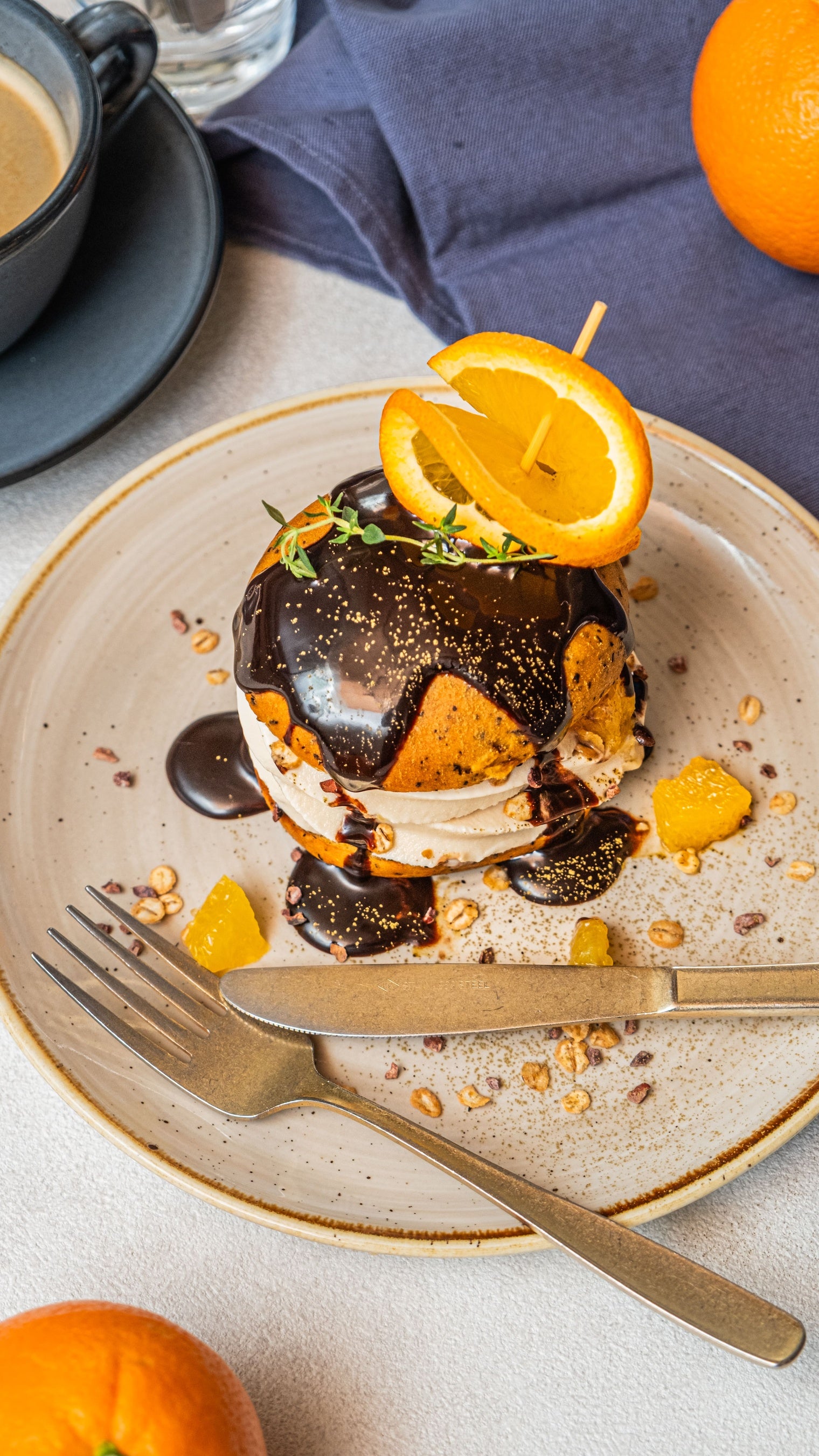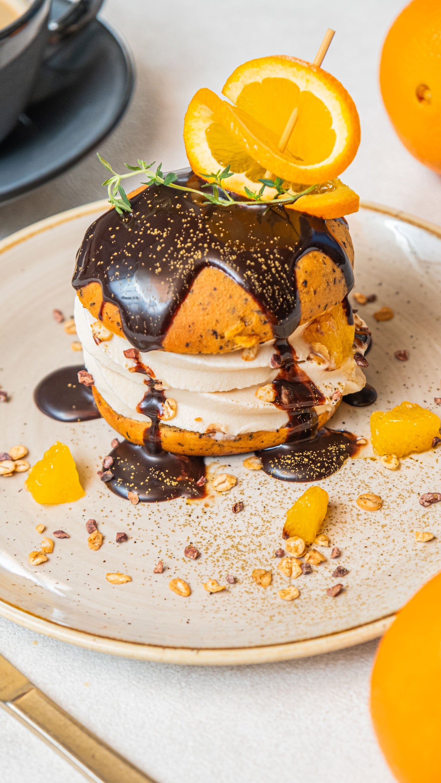 紅茶とオレンジが香るゼンブブレッドに、フレッシュなオレンジと紅茶パウダーを合わせることで、より一層華やかに。甘酸っぱさとチョコレートの豊かな余韻が広がる、満足度が高いのにヘルシーなデザートです。