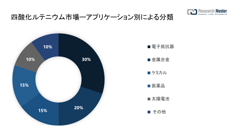 世界の四酸化ルテニウム市場は、電子抵抗器、金属合金、ケミカル、医薬品、太陽電池などへのアプリケーション別に基づいて、需要と供給について分割および分析されています。これらのうち、化学セグメントは、世界の四酸化ルテニウム市場のほぼ~49%を保持することにより、2035年までに最大の収益に対応すると推定されています。セグメントの成長に起因する主な要因は、世界中で化学物質が大量に消費されていることです。 最近の統計によると、2020年には世界の化学物質消費量が3兆米ドル以上を占めました。 四酸化ルテニウムの様々な特性は、それを化学工業で多くの活動に使用するのに有益であります。さらに、化学セクターの急速な成長とともに世界中に化学工場が存在することも、今後数年間のセグメント成長の指標と見なされます。
