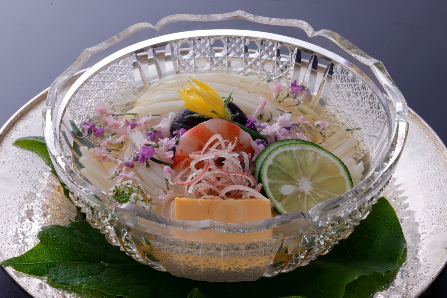 京都の名料亭『菊乃井』本店の厨房では、夏、そうめんがまかないに登場する日が増える。写真は菊乃井流 “まかないそうめん” 。具材は煮椎茸、卵豆腐、彩りにすだちやみょうが、食用花などを添える。出汁の比率を多めにした清涼感のある一品。誌面では「京都風」めんつゆのつくり方と、そうめんの茹で方を紹介します。