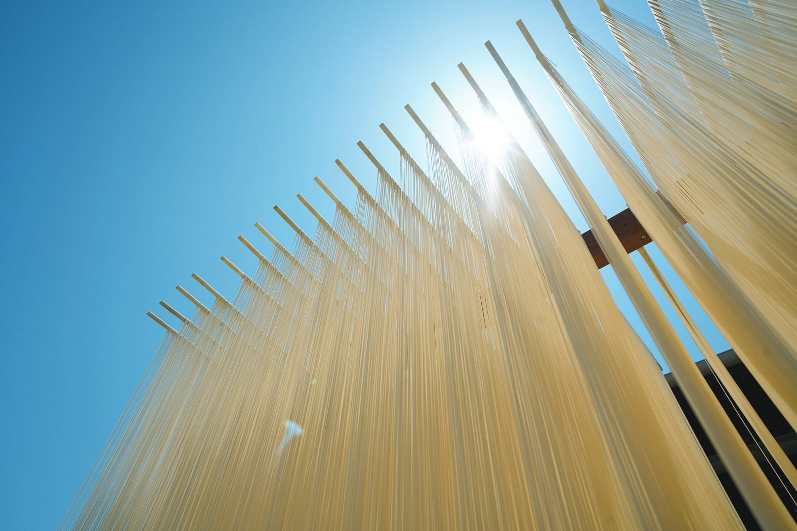 小豆島(香川県)の澄み渡る青空の下で天日干しされるそうめん。400年にわたり伝承されている “手延べ” の技で入念に引き延ばしたそうめんは、乾燥による縮みで麺が切れぬよう、張り具合を調整しながら干す。
