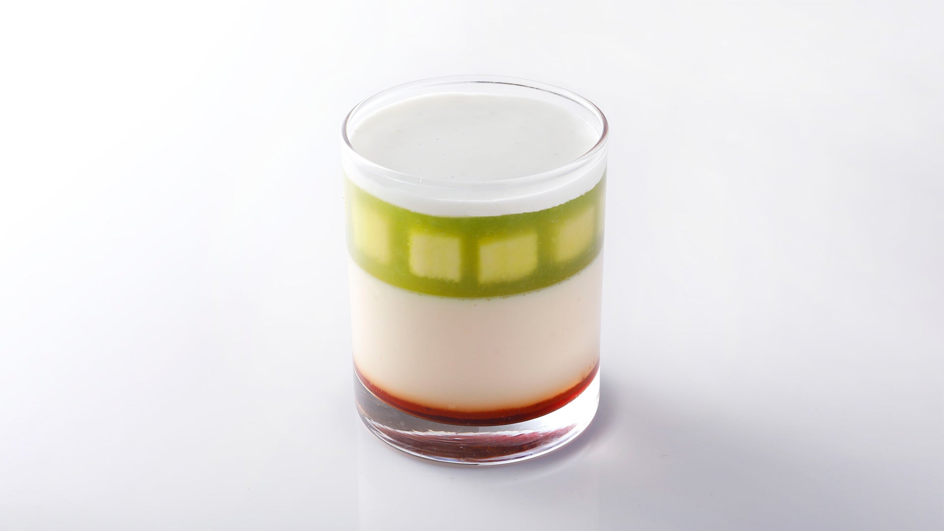 岩手県産の岩泉(いわいずみ)ヨーグルトを使用したゼリーに、アップルマンゴーの果実、甘酸っぱいパッションフルーツとマンゴーの濃厚なジュレをトッピングした、甘酸っぱさ広がるグラススイーツ。