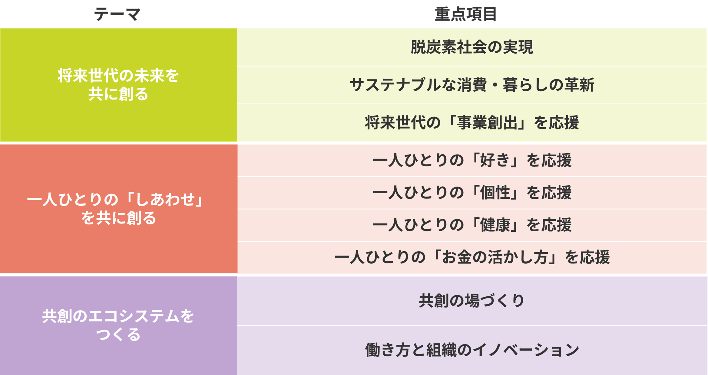 丸井グループは、めざす方向性を明確化した「インパクト」を目標にかかげ、その実現と利益の両立をめざしています。「インパクト」は、①将来世代の未来を共に創る、②一人ひとりの「しあわせ」を共に創る、③共創のエコシステムをつくるという3つのテーマからなり、ユニークなアイデアと技術を持つスタートアップとのオープンイノベーションによる“共創”は、「インパクト」の実現に不可欠なものと考えます。
