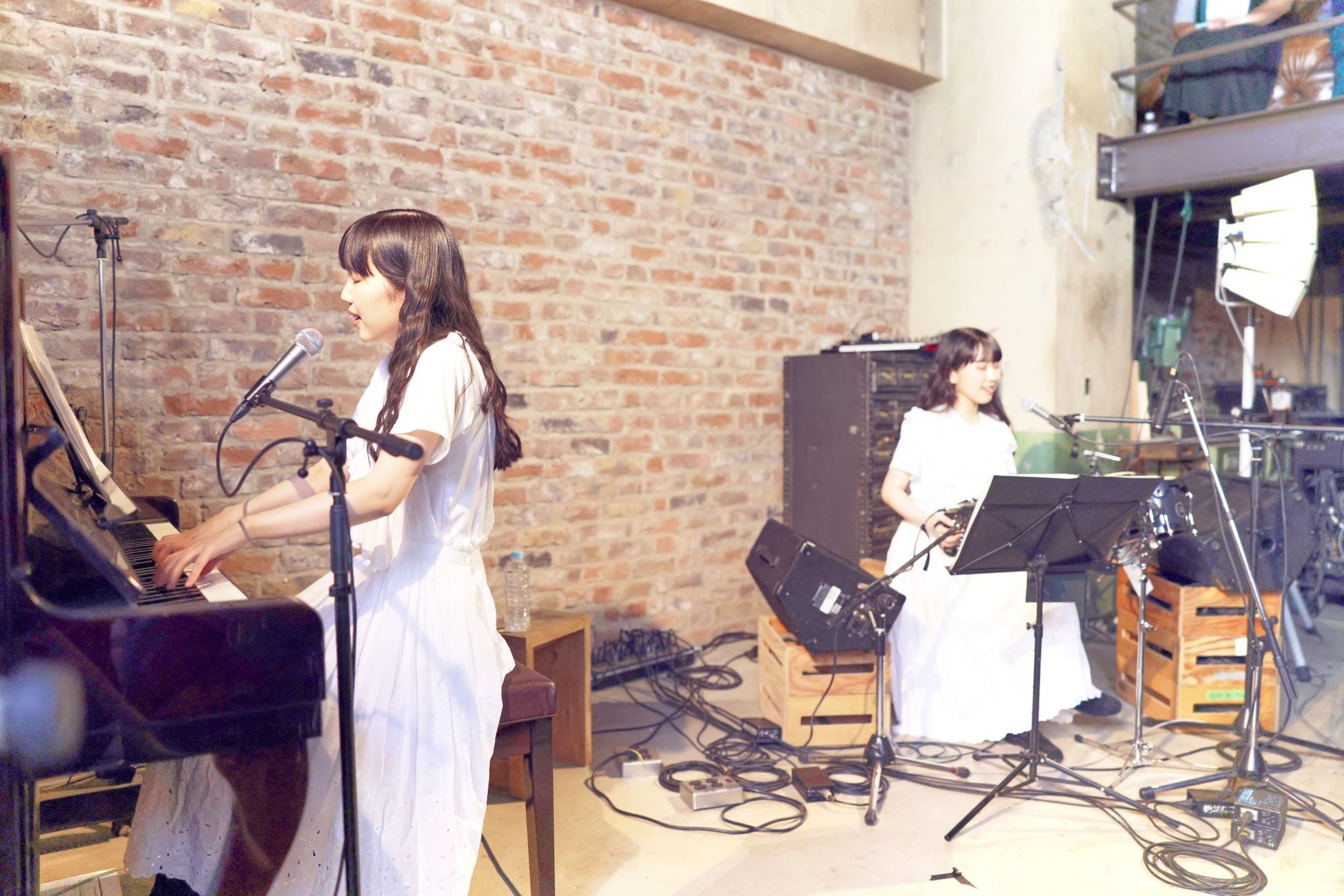 15:00開演の1部“Melody Blanc”にふたりは真っ白なワンピース姿で登場。1曲目の「実りの唄」ではMona がピアノをどっしりとした音で奏で、Hinaが “ピカソボウ”という小さな弓のようなものでギターを鳴らし、スパニッシュな音色が響く。原曲はピアノと打ち込みで季節の移ろいを表現しているのだが、この日の印象は夏のジリジリとした暑さを帯びたようなものだった。