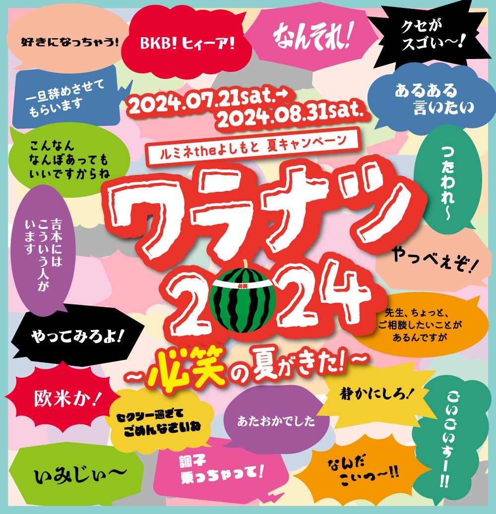 このたび、ルミネtheよしもとでは日頃応援いただいているお客様に感謝を込めて、2024年7月20日(土)~8月31日(土)にルミネtheよしもと夏キャンペーン『ワラナツ2024~必笑の夏がきた!~』を実施いたします。