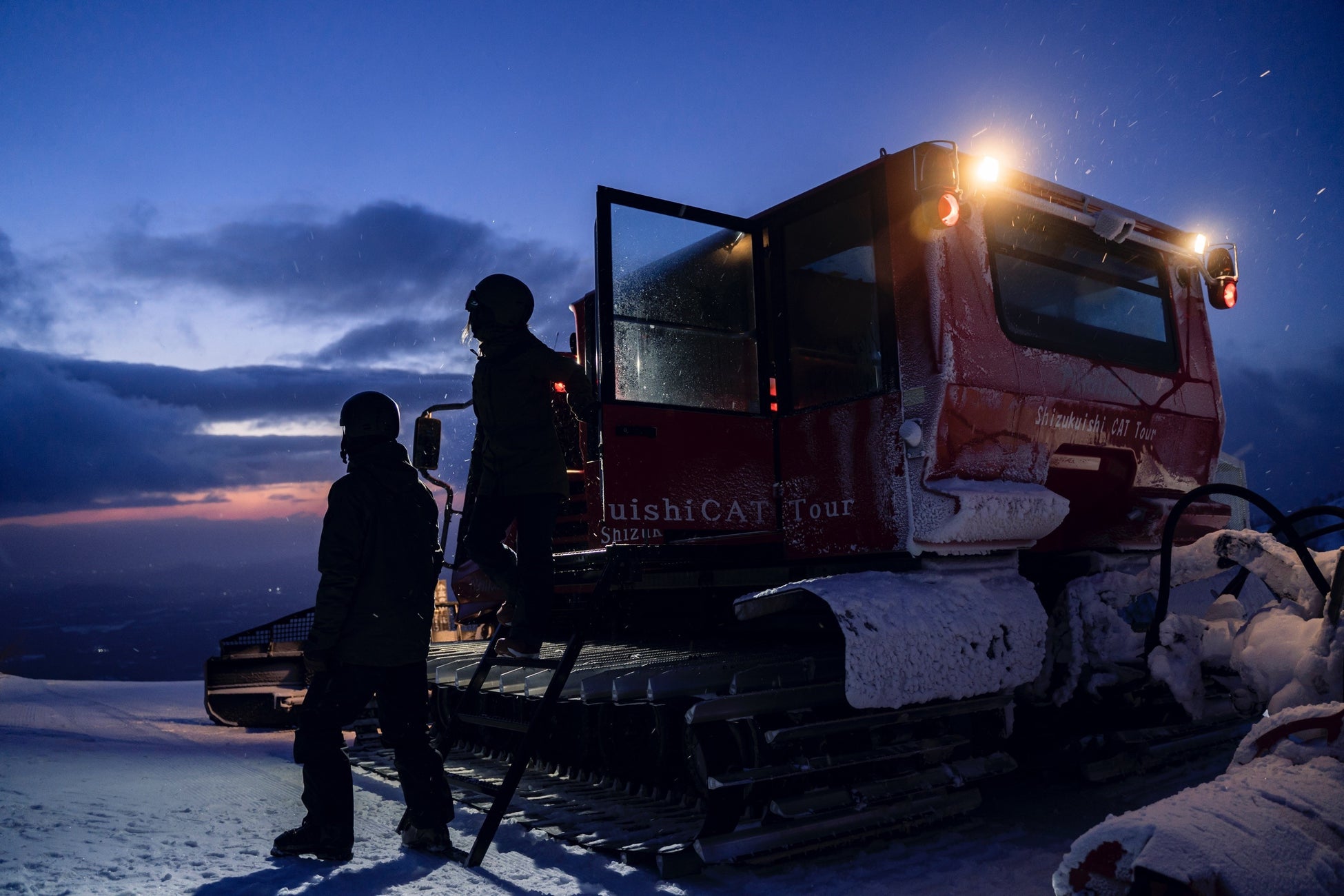 CAT(雪上車)に乗って朝日を望むツアー。雫石スキー場 小高倉山の山頂から望む、光景はまさに圧巻の非日常体験を味わえます。