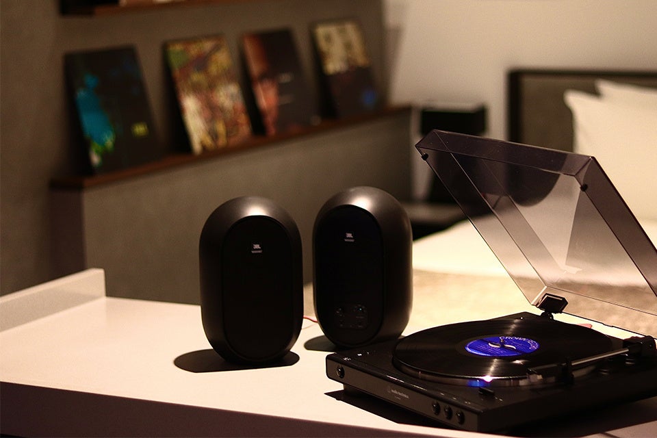 グラミー賞受賞アーティスト等も足繁く通った札幌の伝説的レコードストア「Records-Records」が厳選したレコード150枚を客室にご用意。その中からおすすめとしてセレクトしたこだわりの盤を、客室棚に設置しました。また客室にはJBL製品の原音再現能力を獲得した同軸パワード・スタジオモニターをご用意いたします。