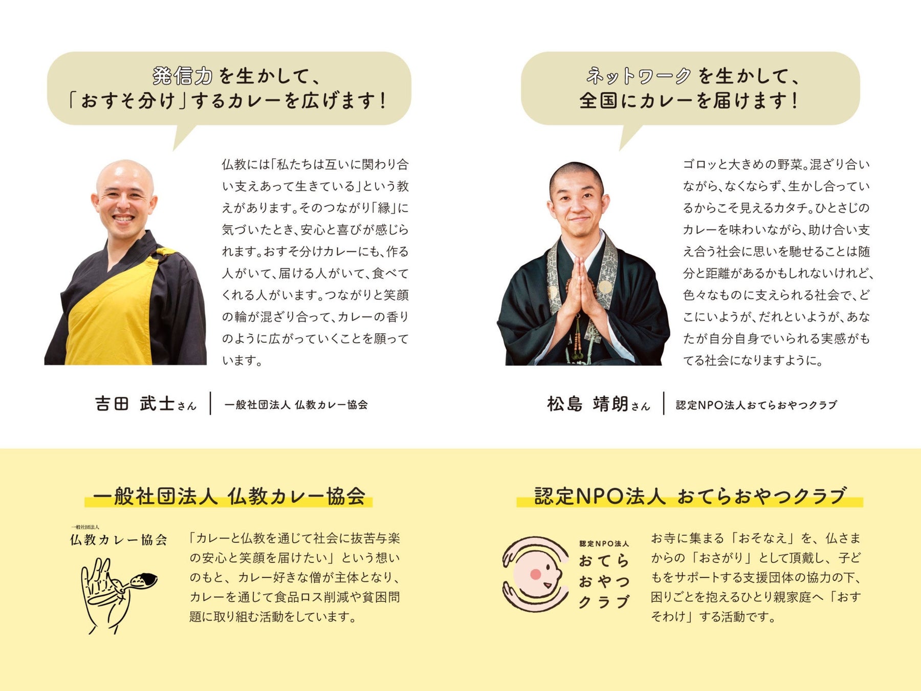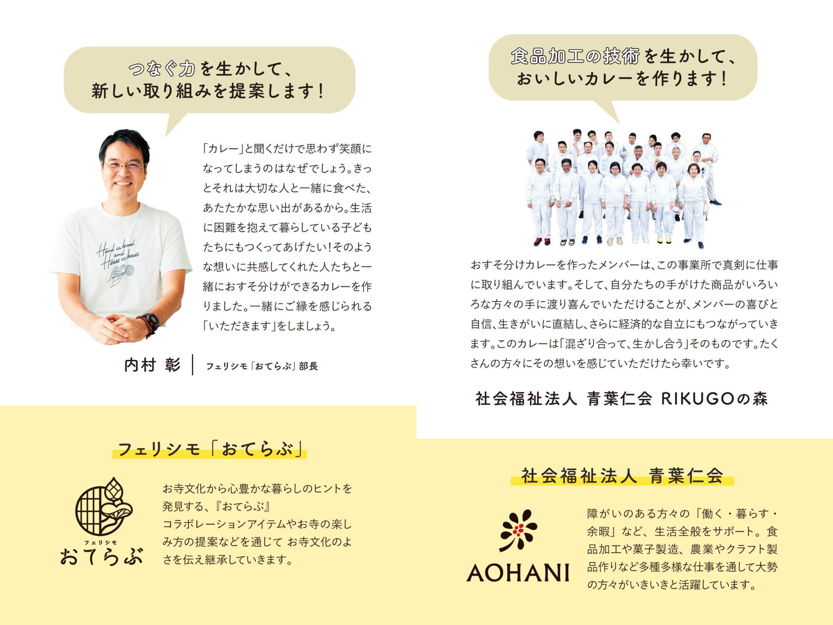 「カレーを使って社会問題を解決できる仕組みを作りたい」というフェリシモ「おてらぶ」の呼びかけに大集結したのは、「認定NPO法人 おてらおやつクラブ」、「一般社団法人 仏教カレー協会」、「社会福祉法人 青葉仁会」の3つの団体です。子どもたちの「いただきます」のために「おてらぶ」に縁のあるカレー好きたちが集まり、それぞれの個性や得意分野を生かして、何度も話し合いや試作を重ね、とびきりの自信作「レトルト精進カレー」を完成させました。