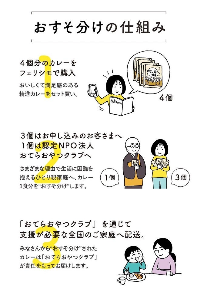 さまざまな理由により生活に困難をかかえ、日々の食事すらままならない家庭は少なくありません。物価高騰や光熱費など、増大する生活費に助けを求める生活苦の声は増え続けています。今日も明日も明後日も、ごく当たり前の風景として、子どもたちが笑顔で「いただきます」と言える世の中にするために。みんなの個性がカレーのスパイスのように混ざり合い、お互いの魅力を引き立てあい、思いやりを持って生かし合う、そんな社会にしていくために。フェリシモ「おてらぶ」の声かけにより3つの団体がタッグを結成。スタートしたのが、お客さまにおいしいカレーを味わっていただきながら、同時に無理なく社会支援もできる、“やさしさのおすそ分け”プロジェクトです。みんなの「助けたい」と誰かの「助けてほしい」をやさしくつなぐ、思いやりの架け橋になれるようにという願いがこめられています。