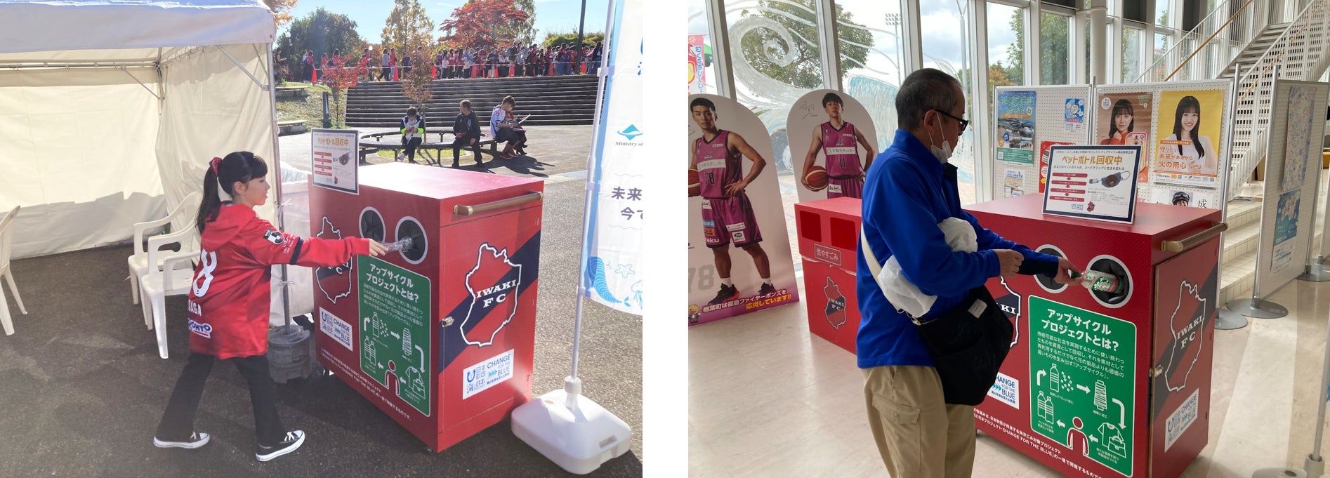 ふくしま海ごみ削減プロジェクトでは、海洋ごみ削減と、福島県のリサイクル率が13.2%と都道府県別でワースト全国2位という課題解決を目的に、いわきFCと連携し「ペットボトル回収機」を制作。昨年11月10日のいわきFCホームゲーム最終節の会場や同月16日、17日に開催されたいわきFCファン感謝祭、さらに約1カ月間に渡り、イオンモールいわき小名浜のオフィシャルショップにてペットボトル回収機を設置し、サポーターの皆さまから資源となるペットボトルを回収いたしました。