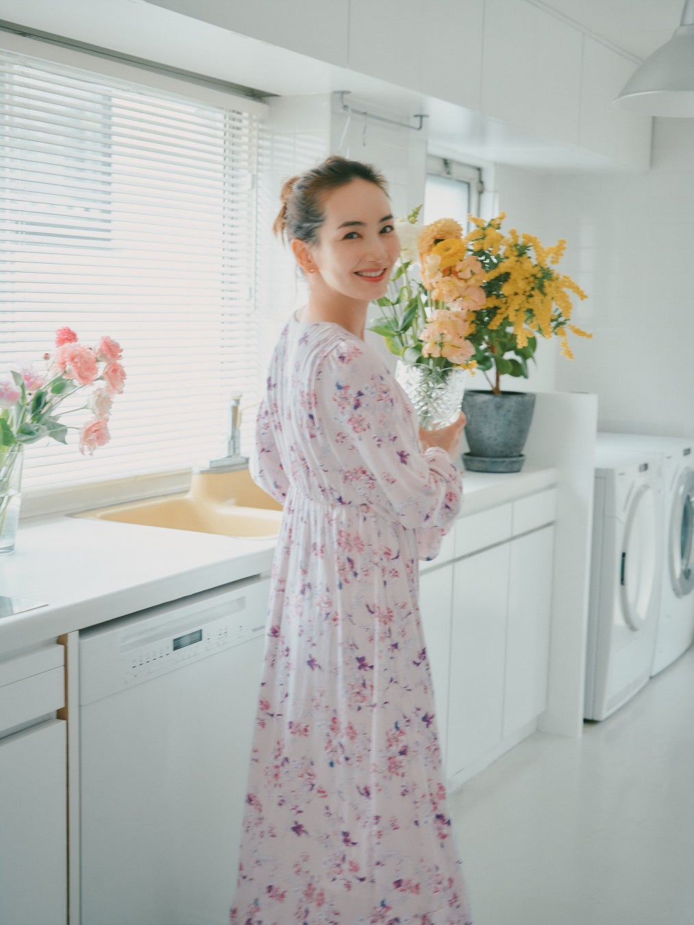 ピンク系の花柄を散りばめた、柔らかなカットソー素材の長袖ワンピース。首元はゆったりと開けたVネックで、胸元にはギャザーをたっぷり効かせたロマンティックなシルエット。袖口はゴム入りなので、さっとまくることもでき便利です。取り外せるカップ付きで、1枚でさらりと着用できます。