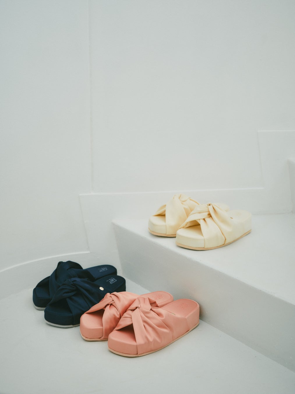 ギャザーを寄せた華やかなサテン素材のアッパーデザインが目を引くルームシューズ。ヒール付きなのでおうちの中でもスタイルアップが叶います。ワンポイントでゴールドのプレートをあしらい、踵部分には大きめのロゴ刺繍も添えました。